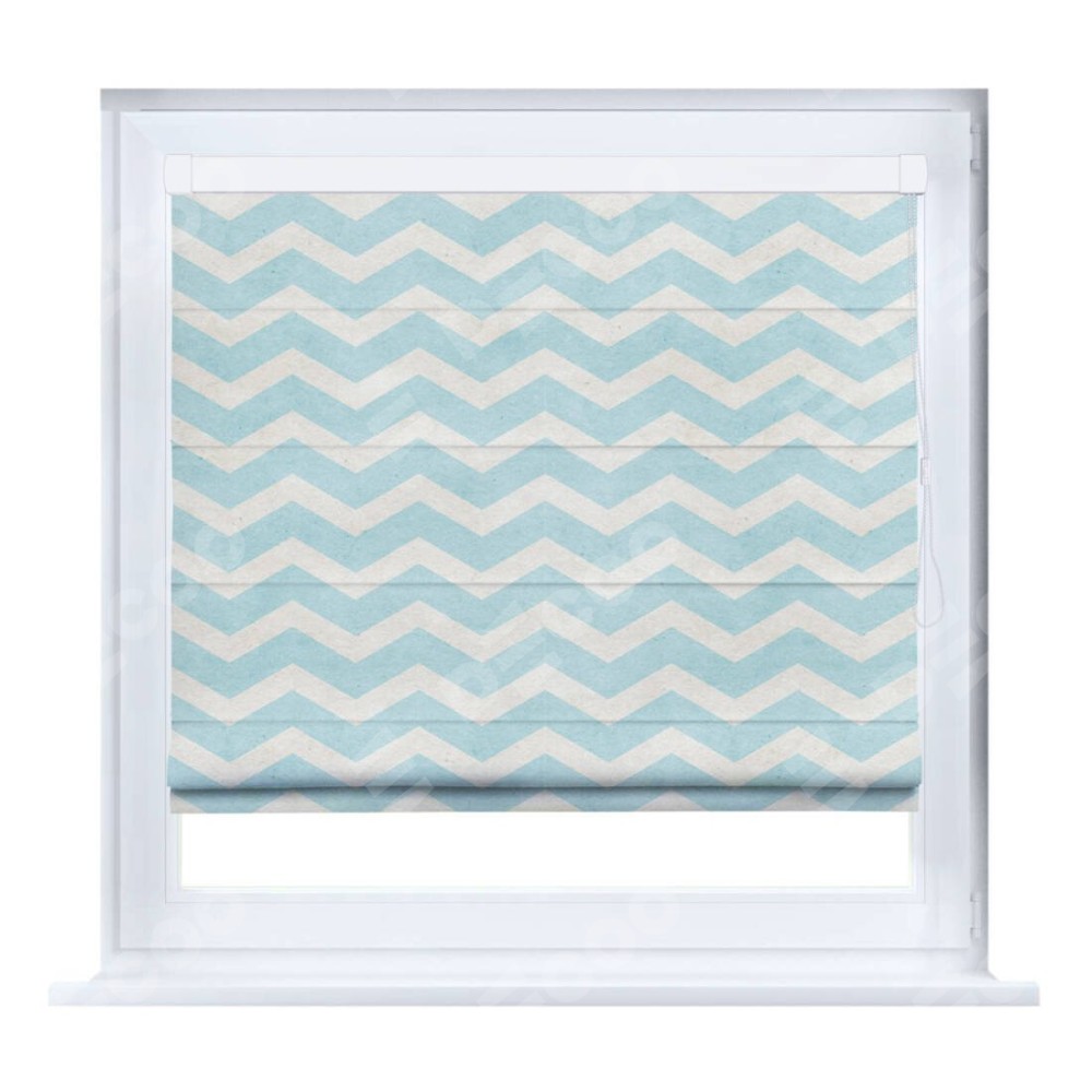 Римская штора производителя «Cortin», устанавливается на створку окна, пошита из ткани блэкаут с нанесением сублимационной печати «Голубой шеврон». Штора шьётся по индивидуальным размерам, для данного типа римской шторы возможная ширина от 35 до 150 см., высота до 250 см.