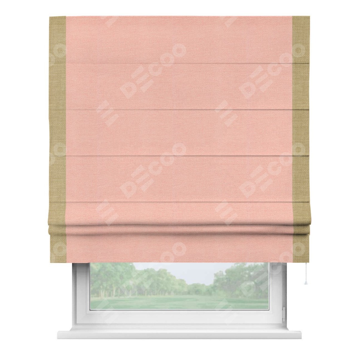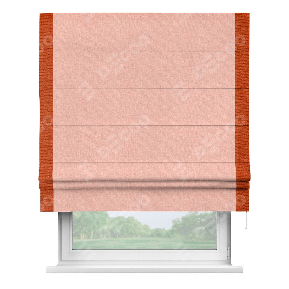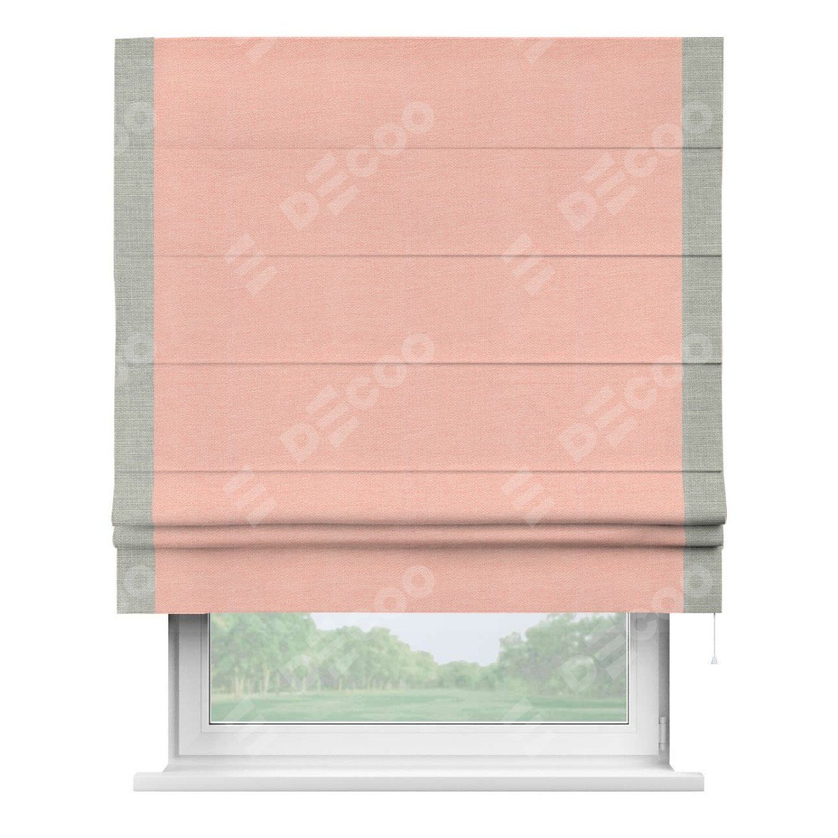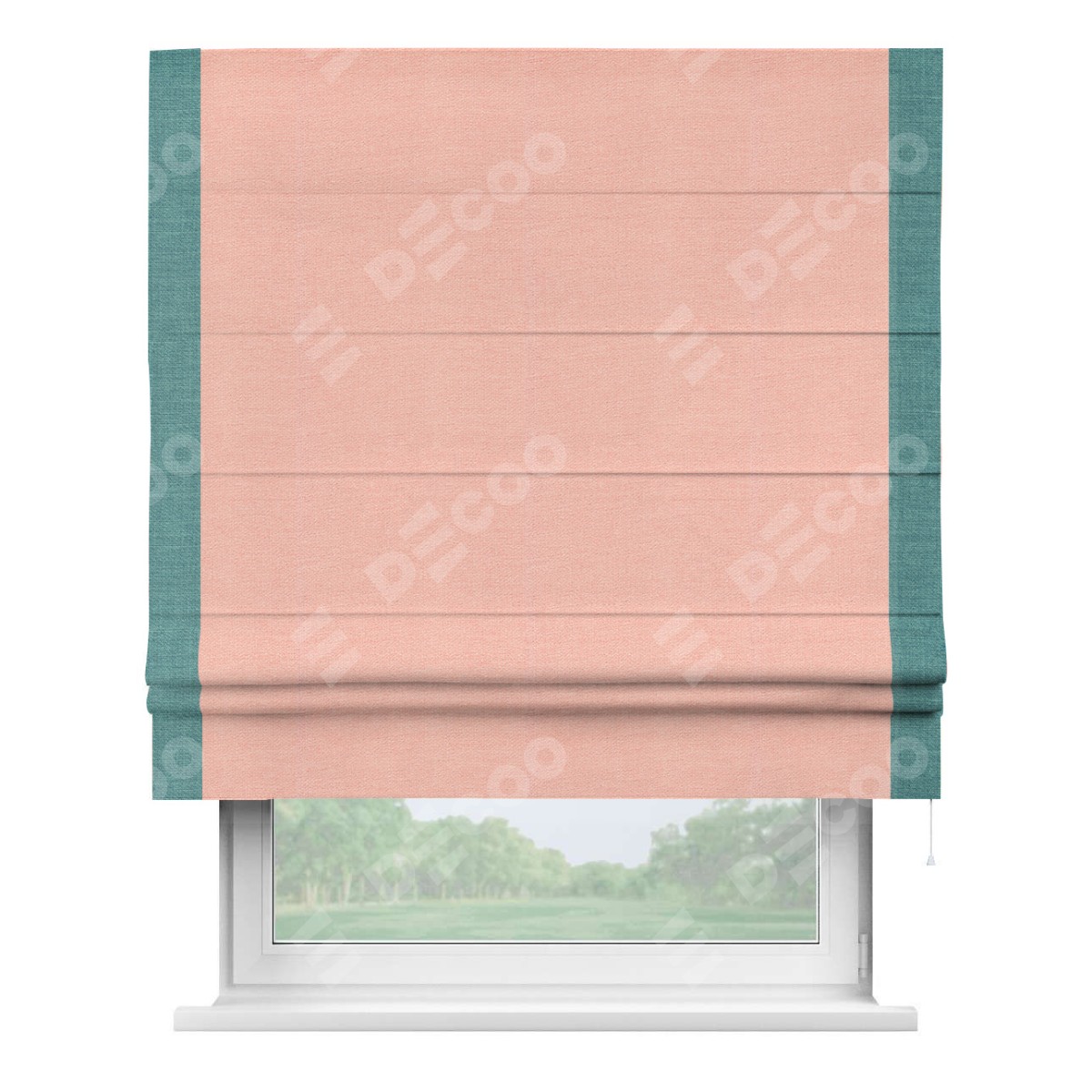 Римская штора производителя «Cortin», используется для проёма, пошита из ткани лён розовый, артикул 00005. Отделка шторы кантом «Стрим Дуо», ткань для канта используется из льна разной расцветки на выбор. Имеет универсальный механизм и подходит для монтажа: на потолок, на стену и в нишу.