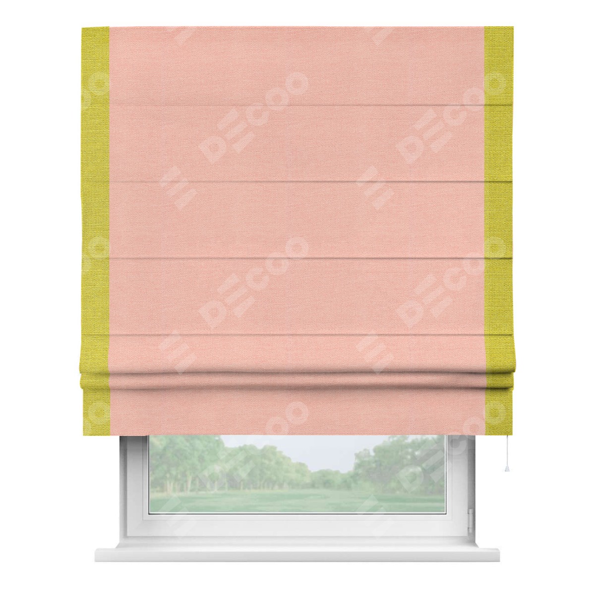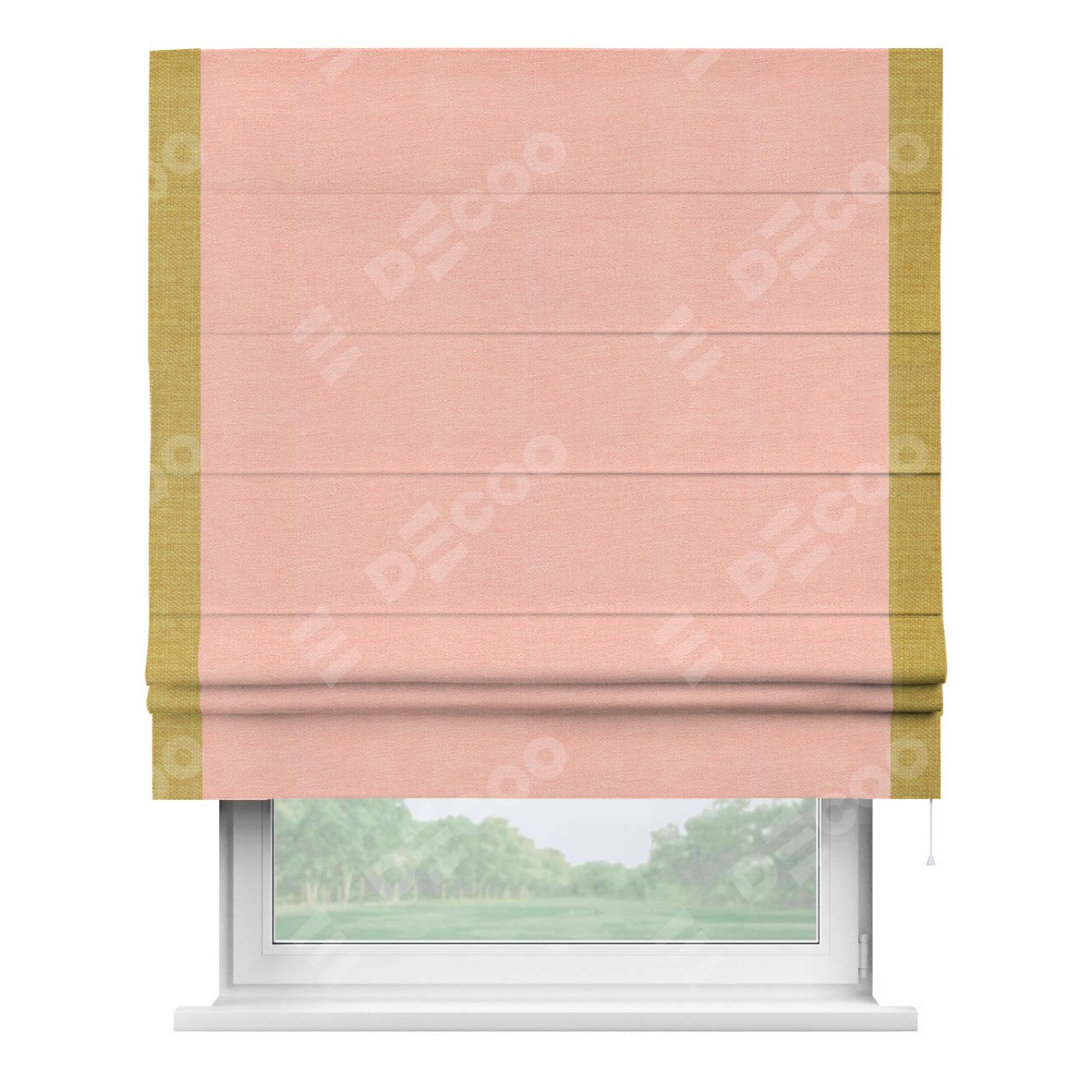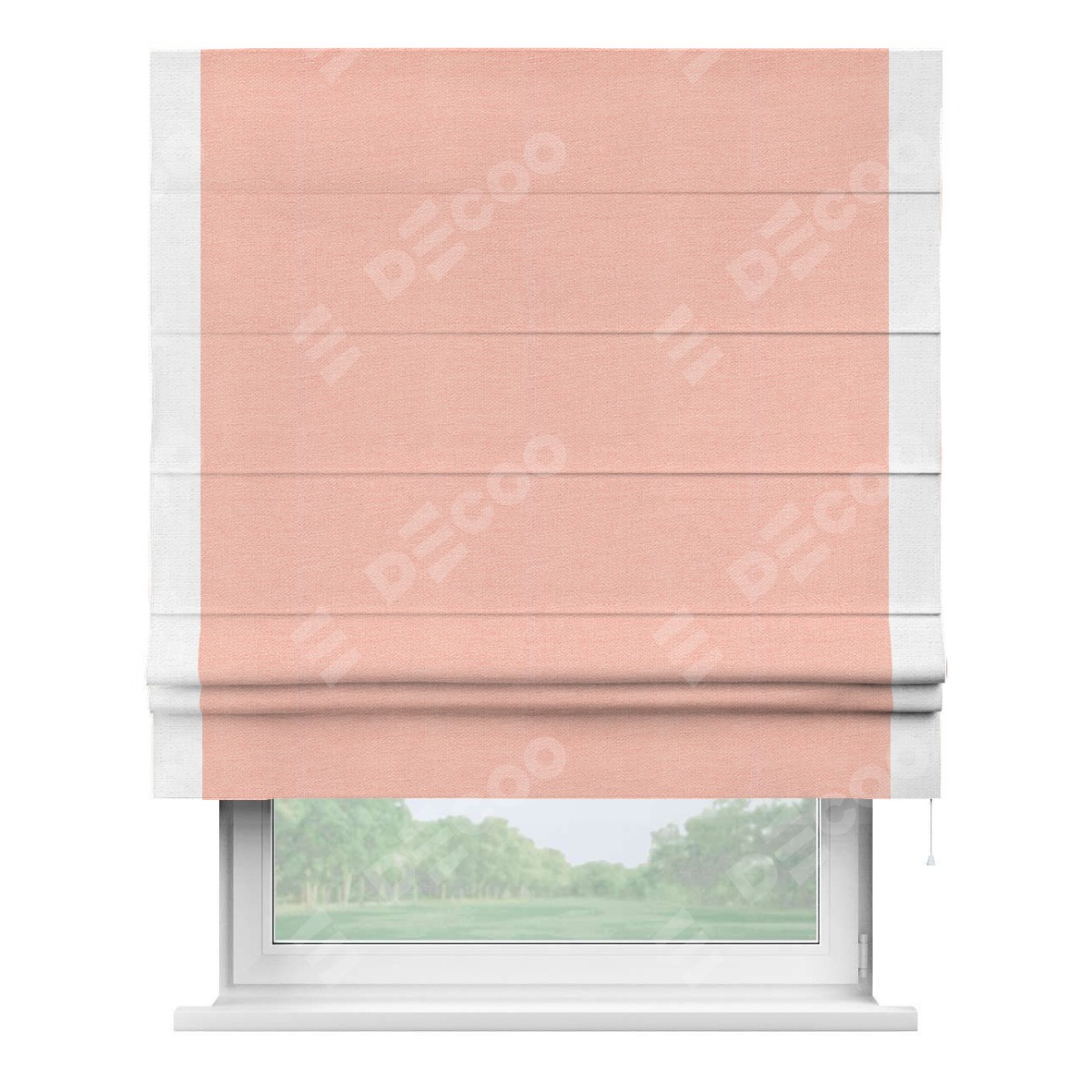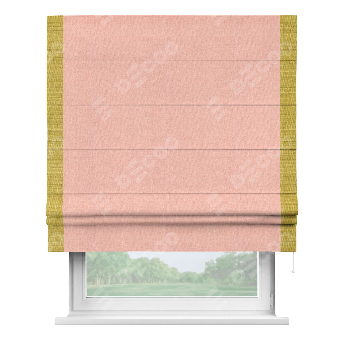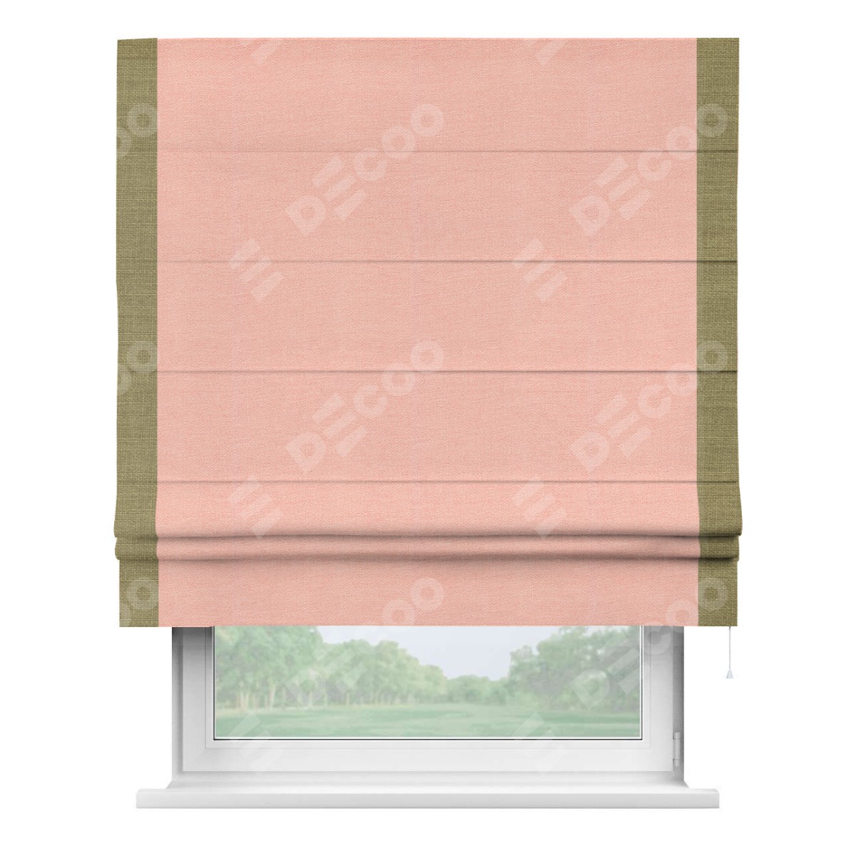 Римская штора производителя «Cortin», используется для проёма, пошита из ткани лён розовый, артикул 00005. Отделка шторы кантом «Стрим Дуо», ткань для канта используется из льна разной расцветки на выбор. Имеет универсальный механизм и подходит для монтажа: на потолок, на стену и в нишу.