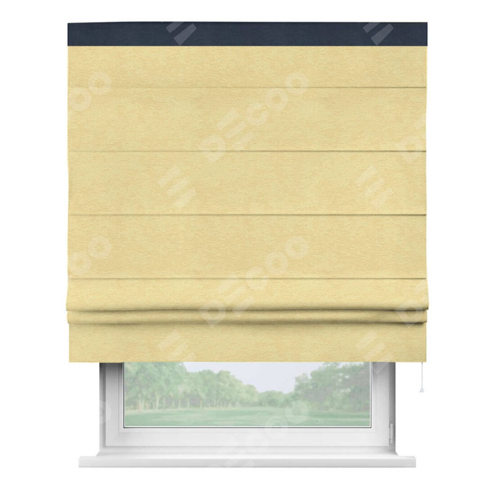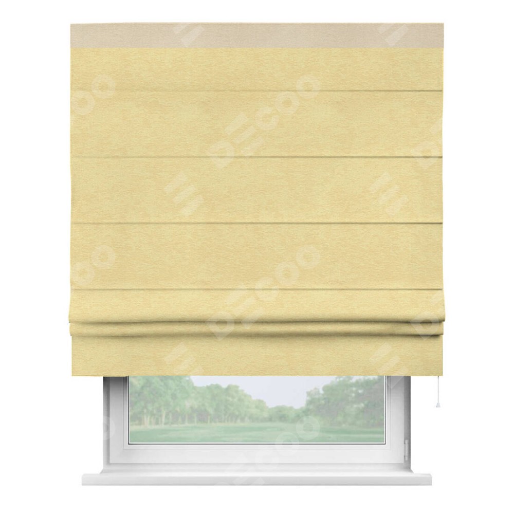 Римская штора производителя «Cortin», используется для проёма, пошита из ткани софт однотонный золотой, артикул 42934. Отделка шторы кантом «Кинг», ткань для канта используется из софта разной расцветки на выбор. Имеет универсальный механизм и подходит для монтажа: на потолок, на стену и в нишу.