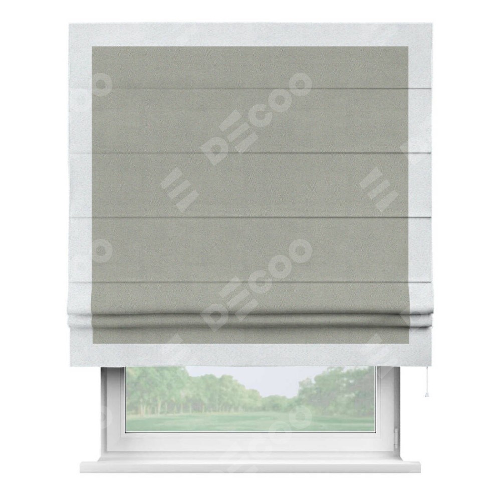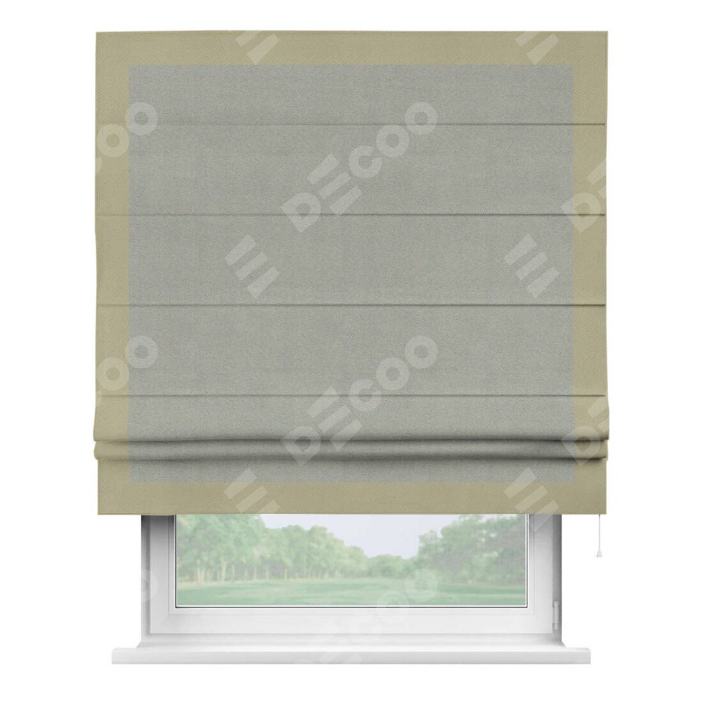 Римская штора производителя «Cortin», используется для проёма, пошита из ткани блэкаут однотонный серый, артикул ткани 88292. Отделка шторы кантом «Чесс», ткань для канта используется из блэкаута однотонного разной расцветки на выбор. Имеет универсальный механизм и подходит для монтажа: на потолок, на стену и в нишу.
