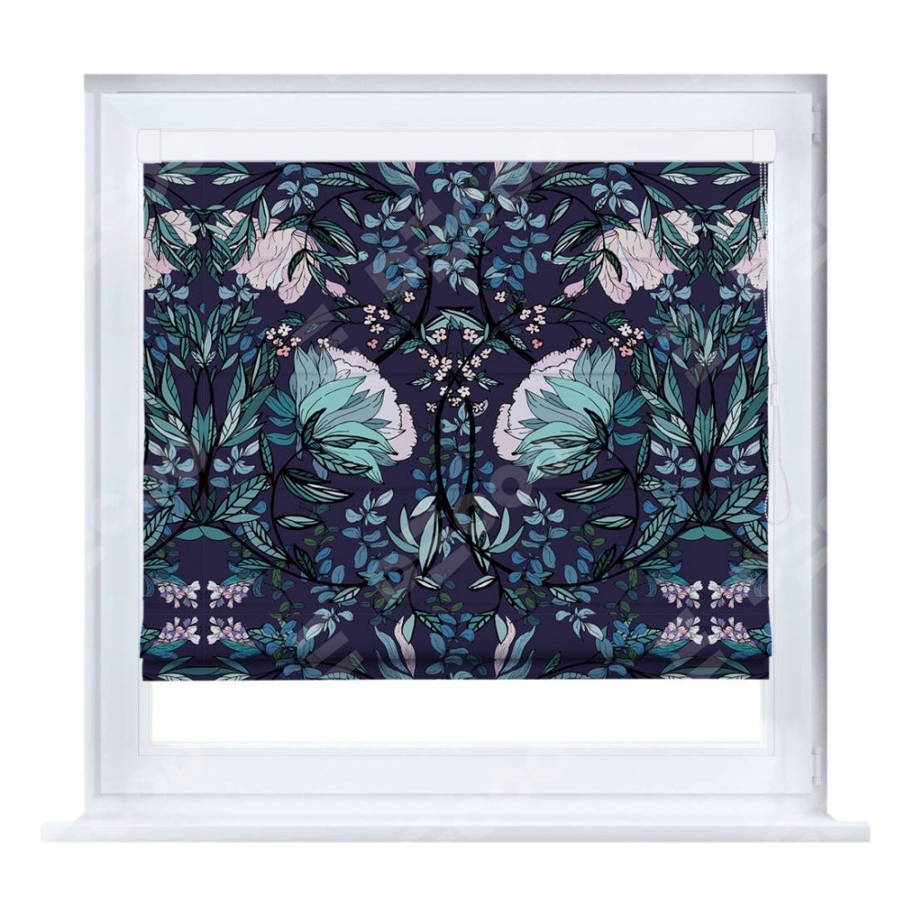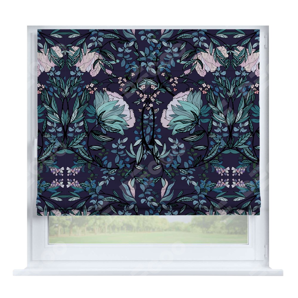 Римская штора производителя «Cortin», устанавливается на створку окна, пошита из ткани блэкаут с нанесением сублимационной печати «Цветочный индиго». Штора шьётся по индивидуальным размерам, для данного типа римской шторы возможная ширина от 35 до 150 см., высота до 250 см.