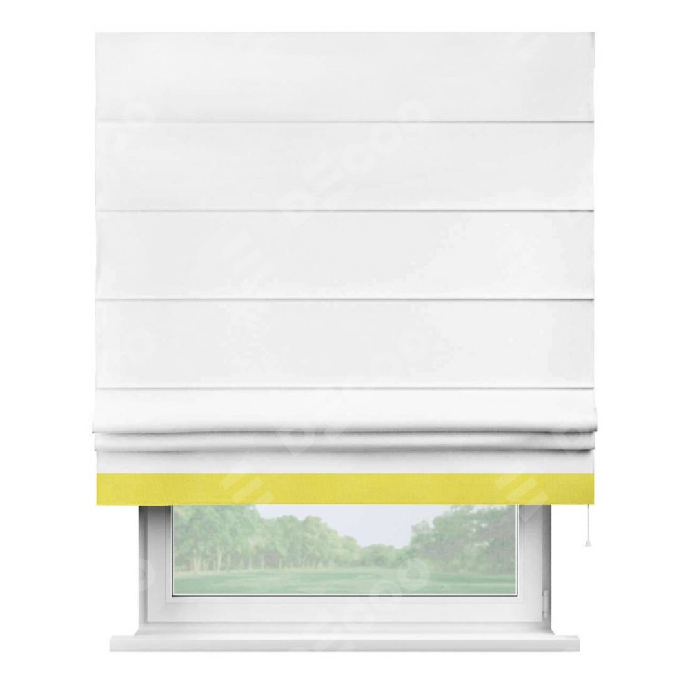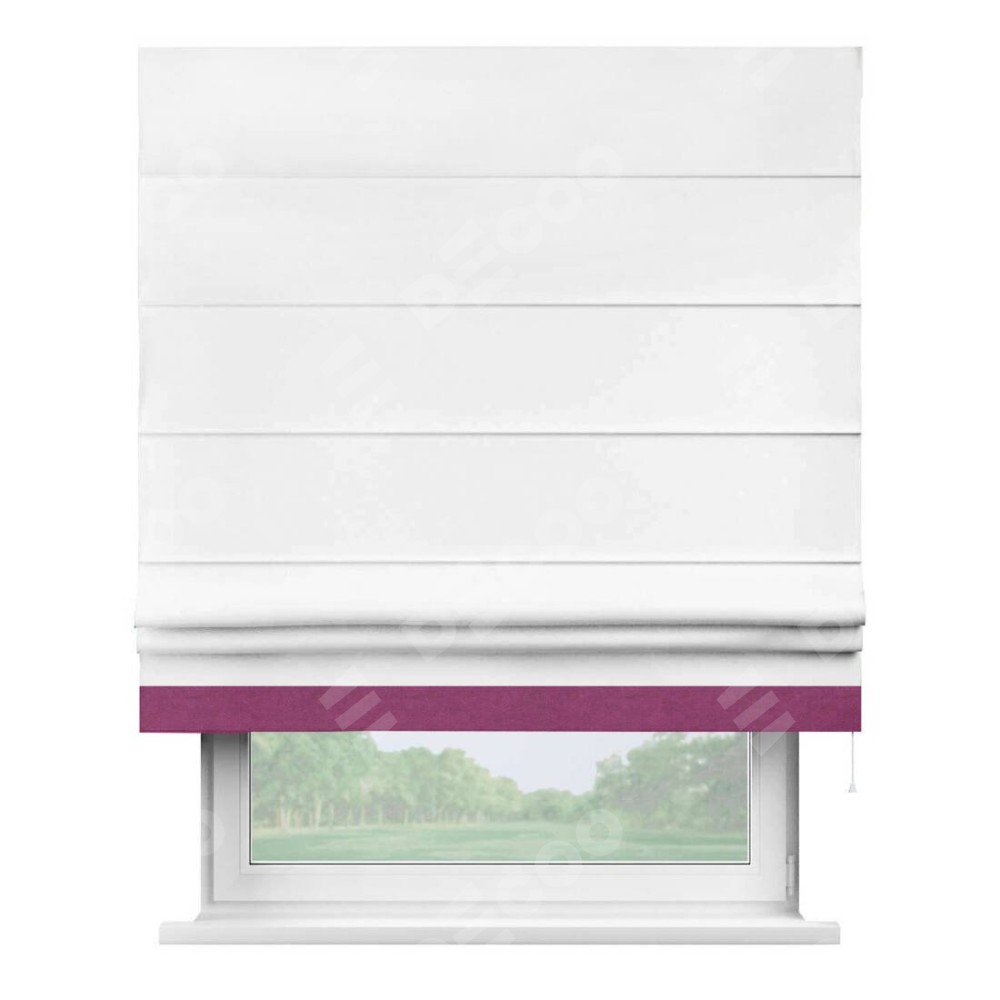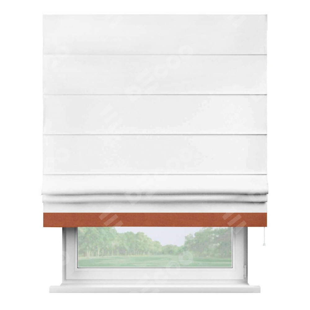 Римская штора производителя «Cortin», используется для проёма, пошита из ткани вельвет белоснежный, артикул ткани 19192. Отделка шторы кантом «Джестер», ткань для канта используется из вельвета разной расцветки на выбор. Имеет универсальный механизм и подходит для монтажа: на потолок, на стену и в нишу.