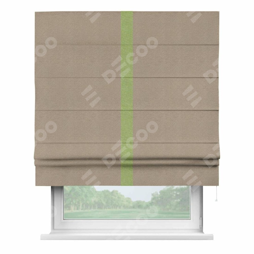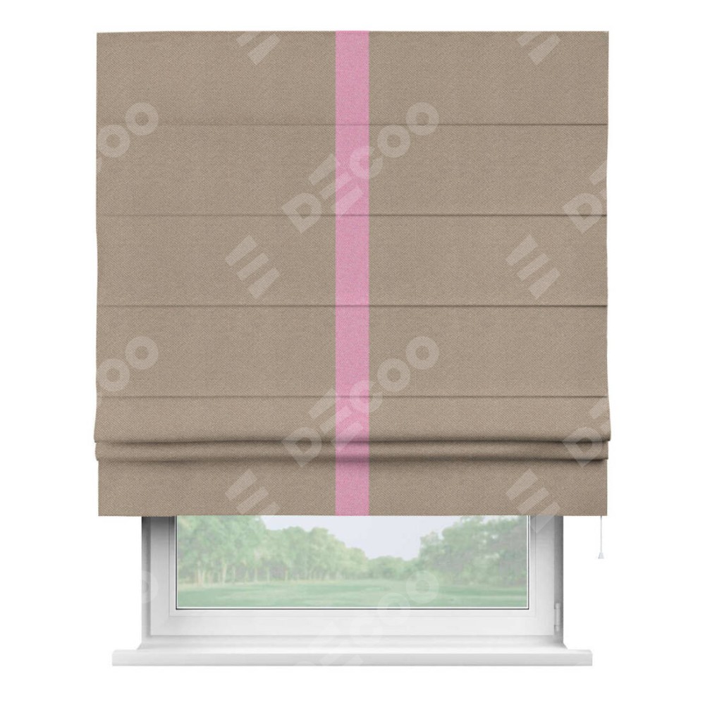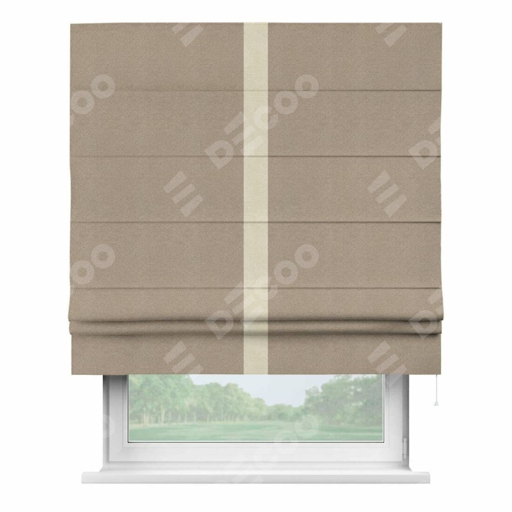 Римская штора производителя «Cortin», используется для проёма, пошита из ткани лён димаут светло-бежевый, артикул 2. Отделка шторы кантом «Хайвэй», ткань для канта используется из льна димаут разной расцветки на выбор. Имеет универсальный механизм и подходит для монтажа: на потолок, на стену и в нишу.