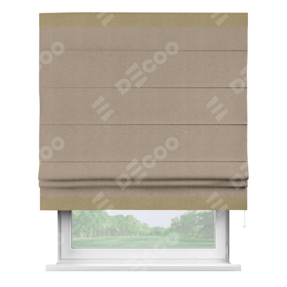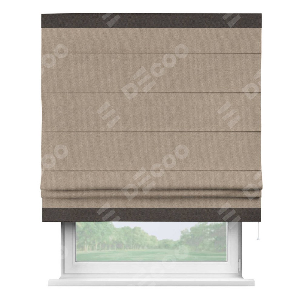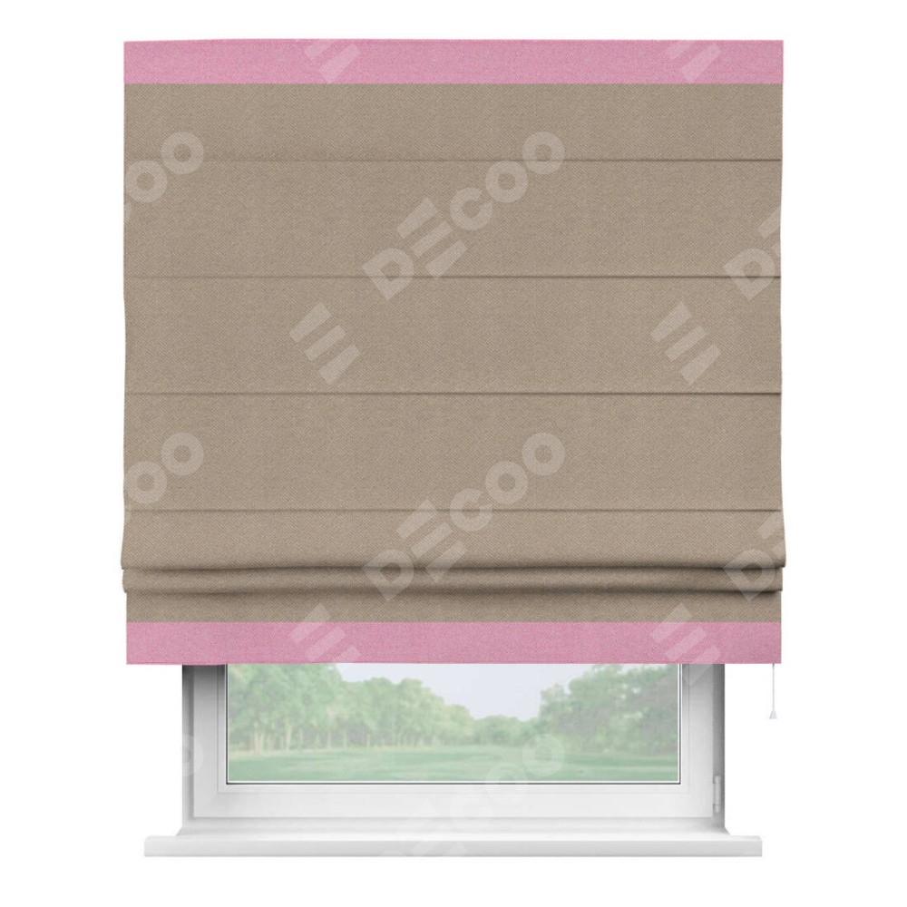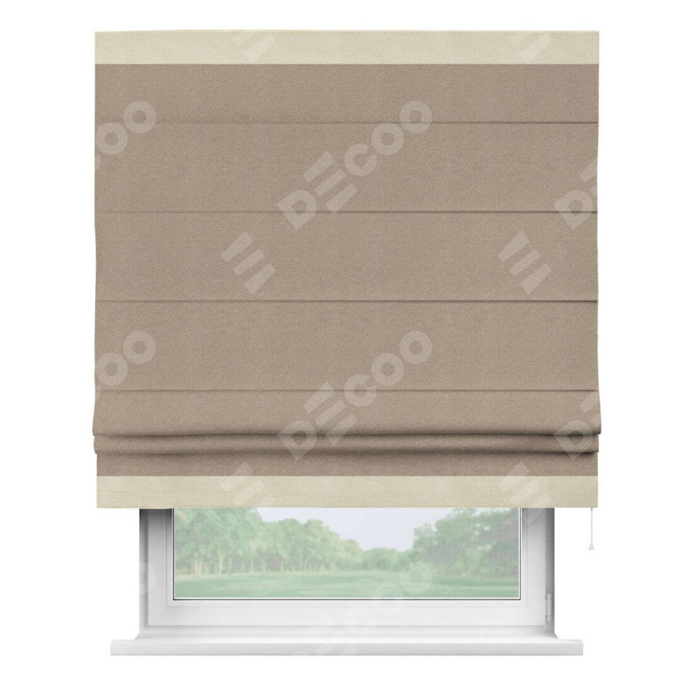 Римская штора производителя «Cortin», используется для проёма, пошита из ткани лён димаут светло-бежевый, артикул 00002. Отделка шторы кантом «Горизонт», ткань для канта используется из льна димаут разной расцветки на выбор. Имеет универсальный механизм и подходит для монтажа: на потолок, на стену и в нишу.