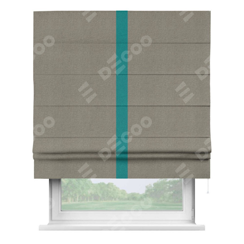 Римская штора производителя «Cortin», используется для проёма, пошита из ткани лён димаут cеро-зелёный, артикул 00003. Отделка шторы кантом «Хайвэй», ткань для канта используется из льна димаут разной расцветки на выбор. Имеет универсальный механизм и подходит для монтажа: на потолок, на стену и в нишу.