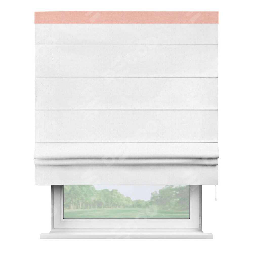 Римская штора производителя «Cortin», используется для проёма, пошита из ткани лён белый, артикул 7439. Отделка шторы кантом «Кинг», ткань для канта используется из льна разной расцветки на выбор. Имеет универсальный механизм и подходит для монтажа: на потолок, на стену и в нишу.