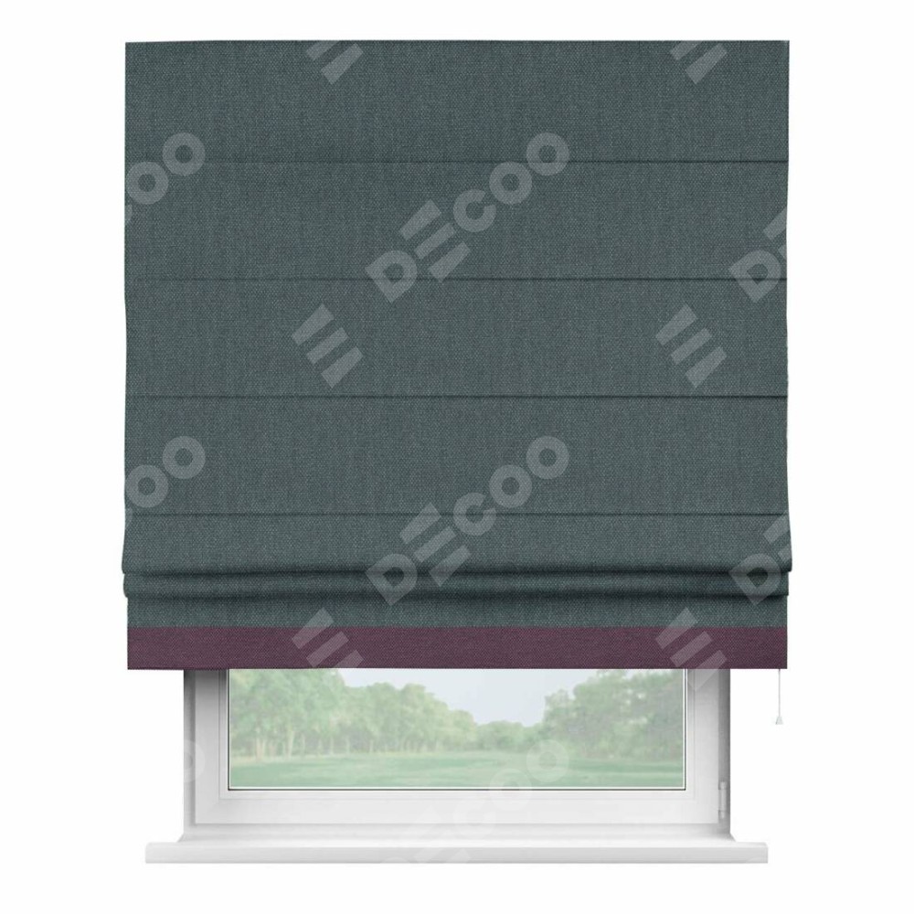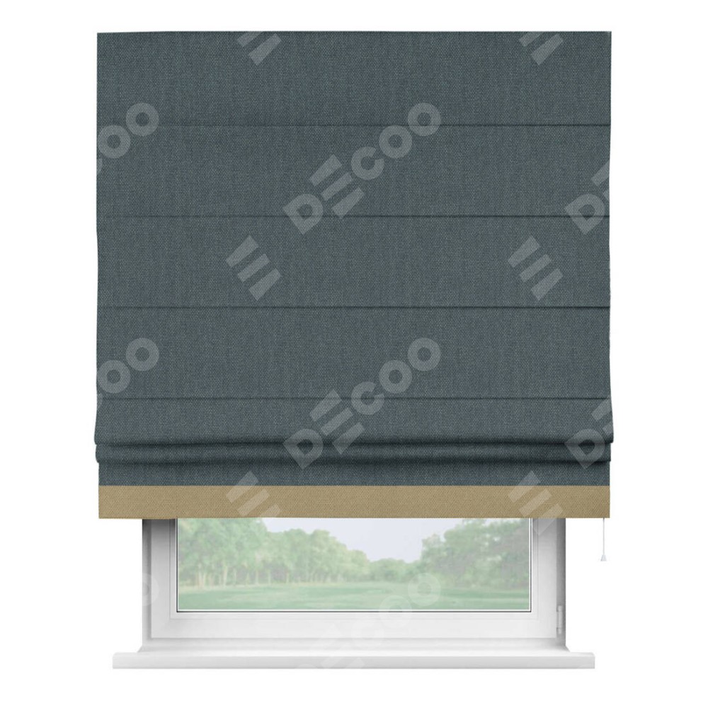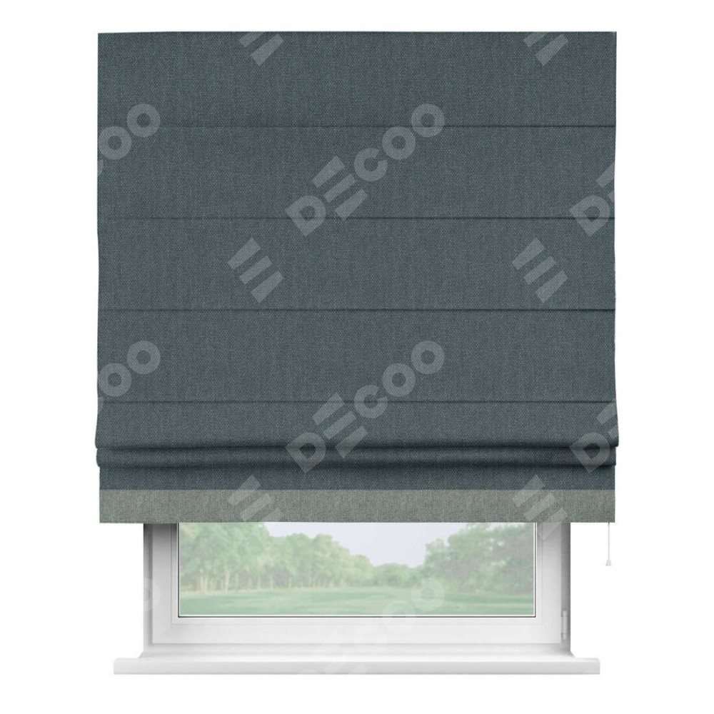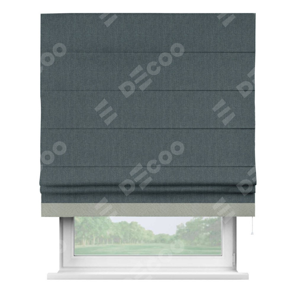 Римская штора производителя «Cortin», используется для проёма, пошита из ткани лён димаут серо-синий, артикул 03238. Отделка шторы кантом «Джестер», ткань для канта используется из льна димаут разной расцветки на выбор. Имеет универсальный механизм и подходит для монтажа: на потолок, на стену и в нишу.