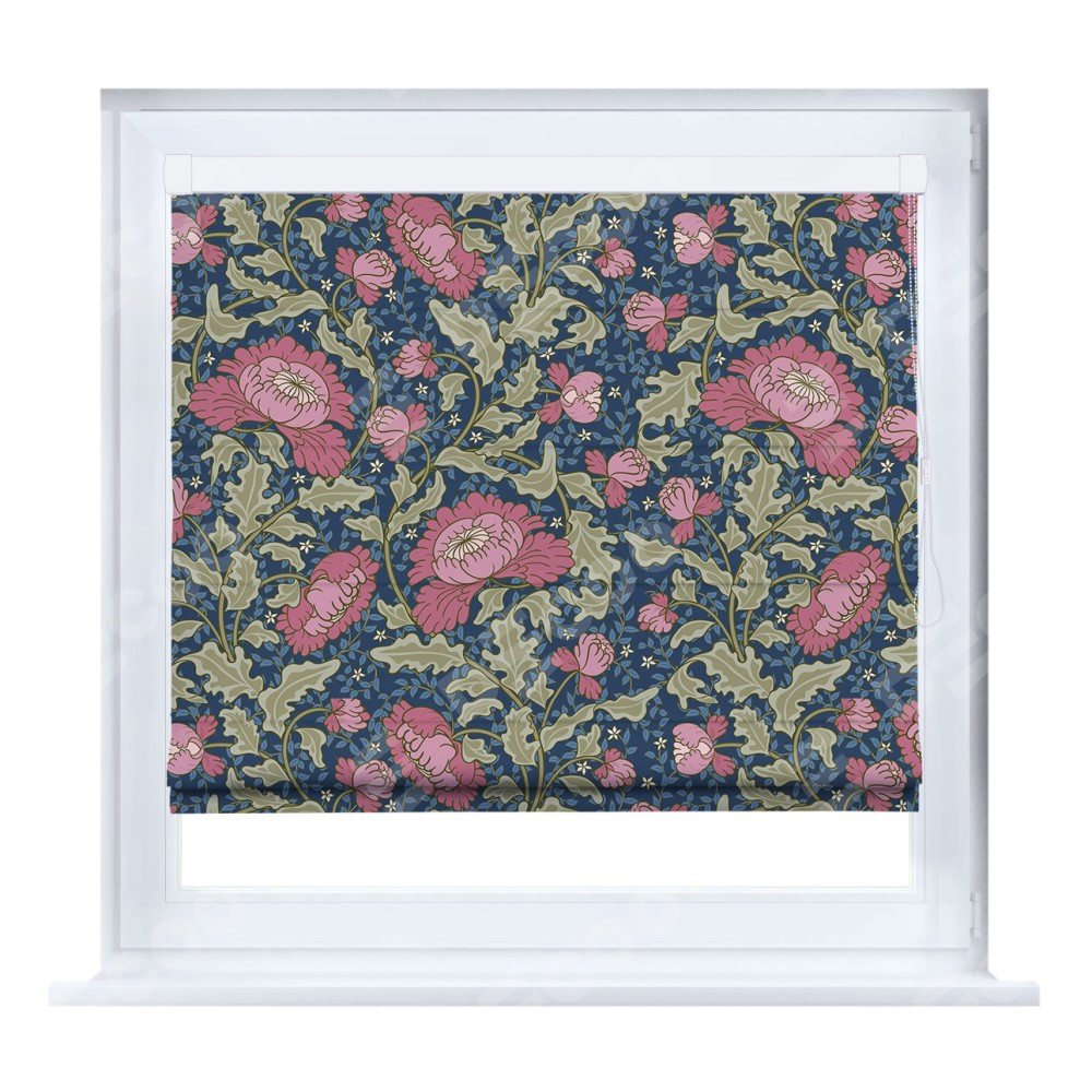 Римская штора кассетного типа, производителя «Cortin», устанавливается только на пластиковые окна и прилегает к стеклопакету, пошита из ткани блэкаут с нанесением сублимационной печати «Розовые цветы».