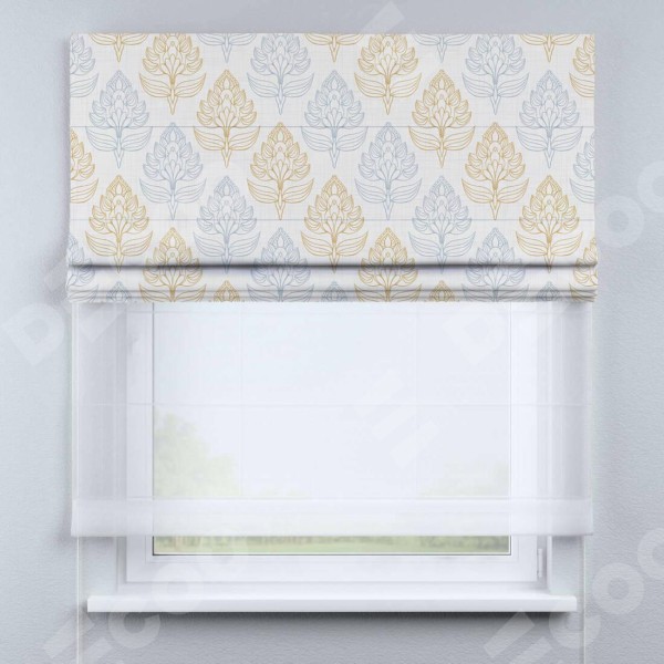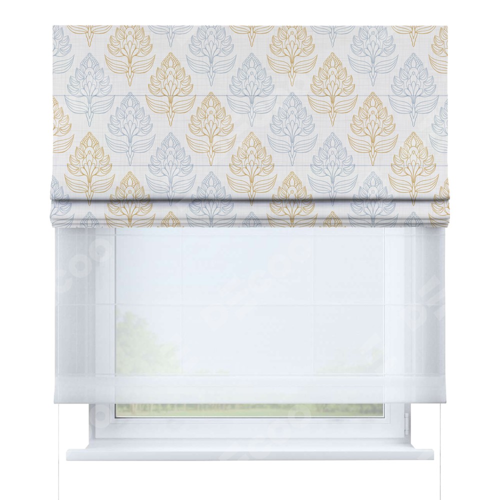 Римская штора день-ночь производителя «Cortin», используется для проёма, пошита из двух полотен, с лицевой блэкаут с нанесением сублимационной печати «Цветочный медальон», вторая ткань тюль (по стандарту комплектуется тюль белого цвета артикул V-01). Имеет универсальный механизм и подходит для монтажа: на потолок, на стену и в нишу.