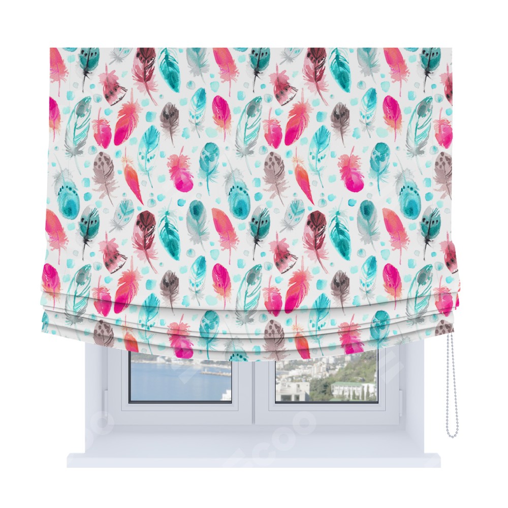 Римская штора Soft производителя «Cortin», используется для проёма, пошита из ткани блэкаут с нанесением сублимационной печати «Перья». Имеет универсальный механизм и подходит для монтажа: на потолок, на стену и в нишу. В отличие от стандартных римских штор, римская штора Soft не имеет горизонтальных вставок и нижнего отвеса. Это позволяет ткани произвольно драпироваться в свободные мягкие складки.