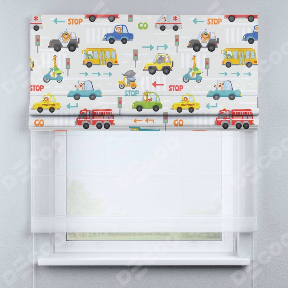 Римская штора день-ночь производителя «Cortin», используется для проёма, пошита из двух полотен, с лицевой блэкаут с нанесением сублимационной печати «Дорожные правила», вторая ткань тюль (по стандарту комплектуется тюль белого цвета артикул V-01). Имеет универсальный механизм и подходит для монтажа: на потолок, на стену и в нишу.