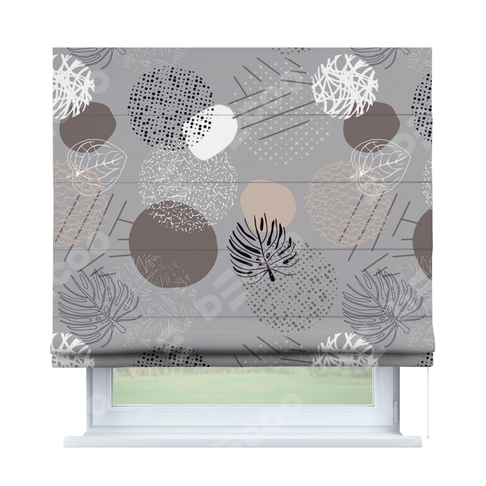 Римская штора производителя «Cortin», используется для проёма, пошита из ткани блэкаут с нанесением сублимационной печати «Ботаника абстракция». Имеет универсальный механизм и подходит для монтажа: на потолок, на стену и в нишу.