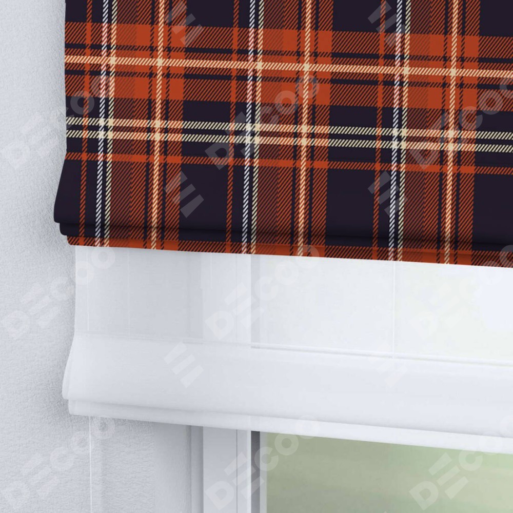 Римская штора день-ночь производителя «Cortin», используется для проёма, пошита из двух полотен, с лицевой блэкаут с нанесением сублимационной печати «Сине-оранжевая клетка», вторая ткань тюль (по стандарту комплектуется тюль белого цвета артикул V-01). Имеет универсальный механизм и подходит для монтажа: на потолок, на стену и в нишу.