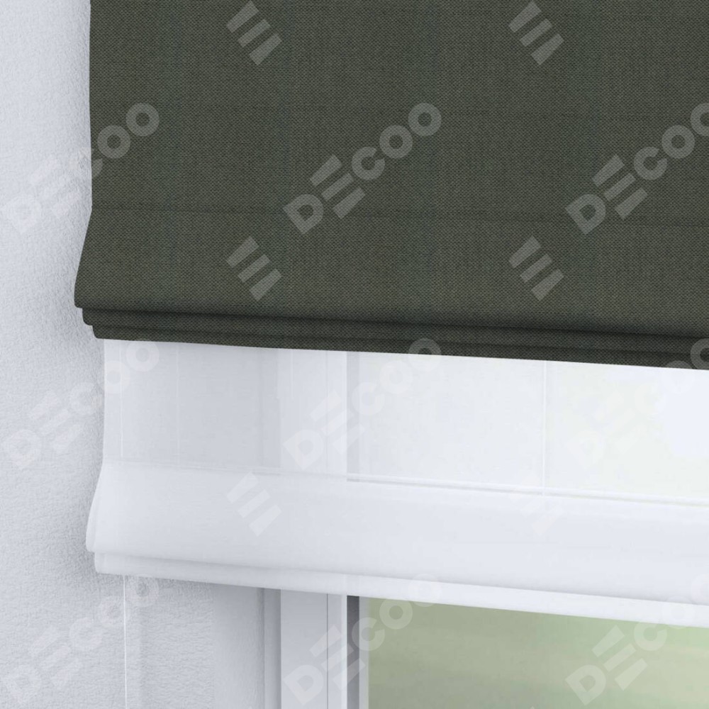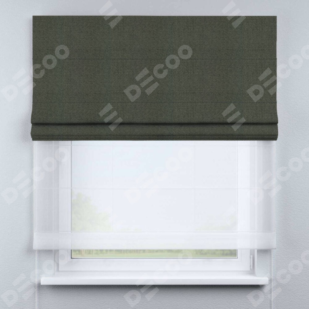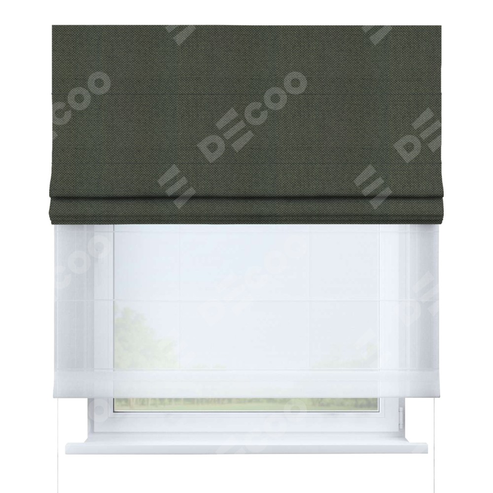 Римская штора день-ночь производителя «Cortin», используется для проёма, пошита из двух полотен, с лицевой стороны лён димаут графит артикул 27, вторая ткань тюль (по стандарту комплектуется тюль белого цвета артикул V-01). Имеет универсальный механизм и подходит для монтажа: на потолок, на стену и в нишу.
