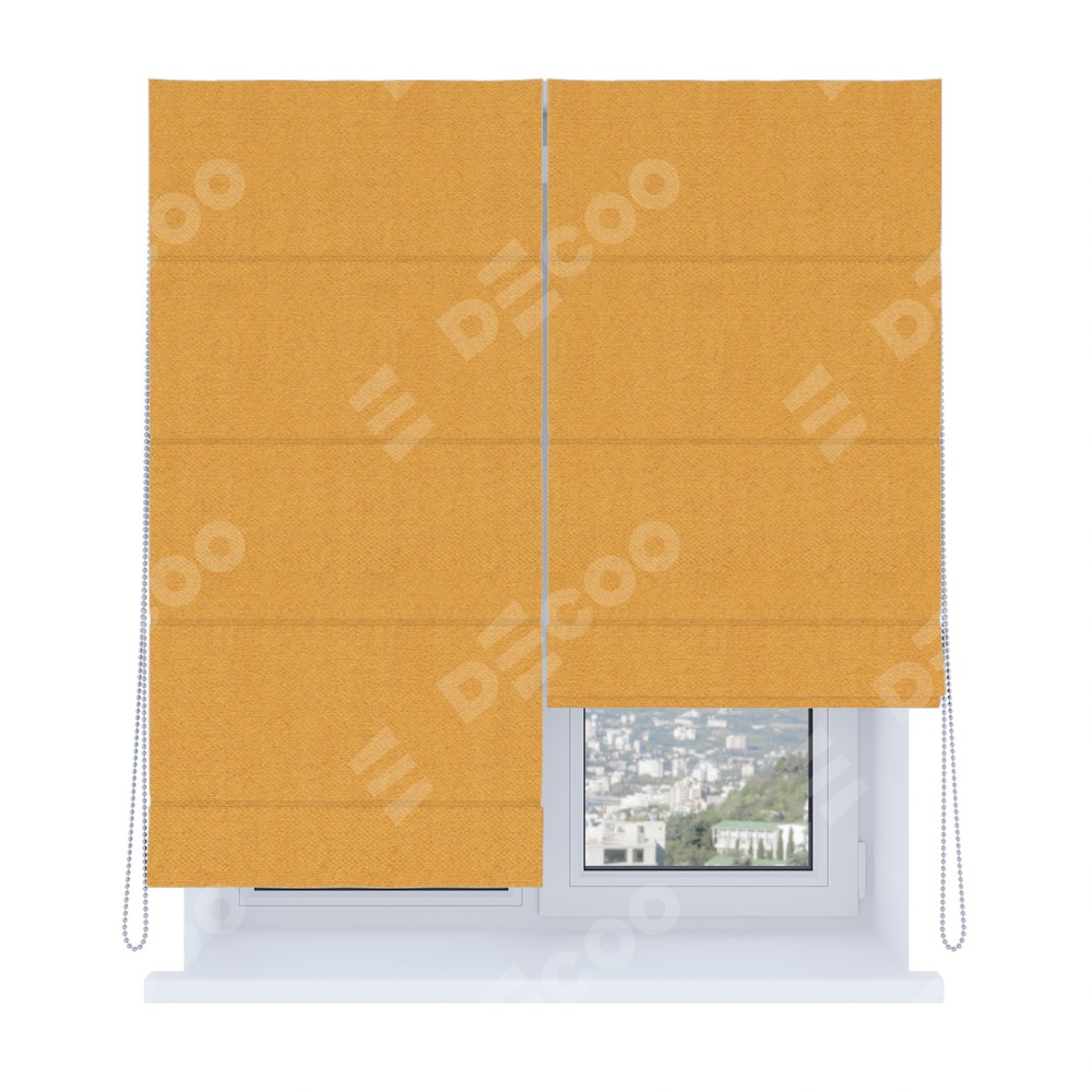 Римская штора производителя «Cortin», используется для проёма, пошита из ткани блэкаут тиснение с блеском золотой, артикул ткани 34626. Изнаночная сторона материала черного цвета, что обеспечивает необходимую светонепроницаемость. Имеет универсальный механизм и подходит для монтажа: на потолок, на стену и в нишу. Удобное управление каждой шторой отдельно.