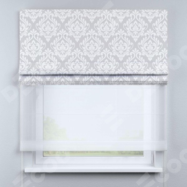 Римская штора день-ночь производителя «Cortin», используется для проёма, пошита из двух полотен, с лицевой блэкаут с нанесением сублимационной печати «Дамаск светлый», вторая ткань тюль (по стандарту комплектуется тюль белого цвета артикул V-01). Имеет универсальный механизм и подходит для монтажа: на потолок, на стену и в нишу.
