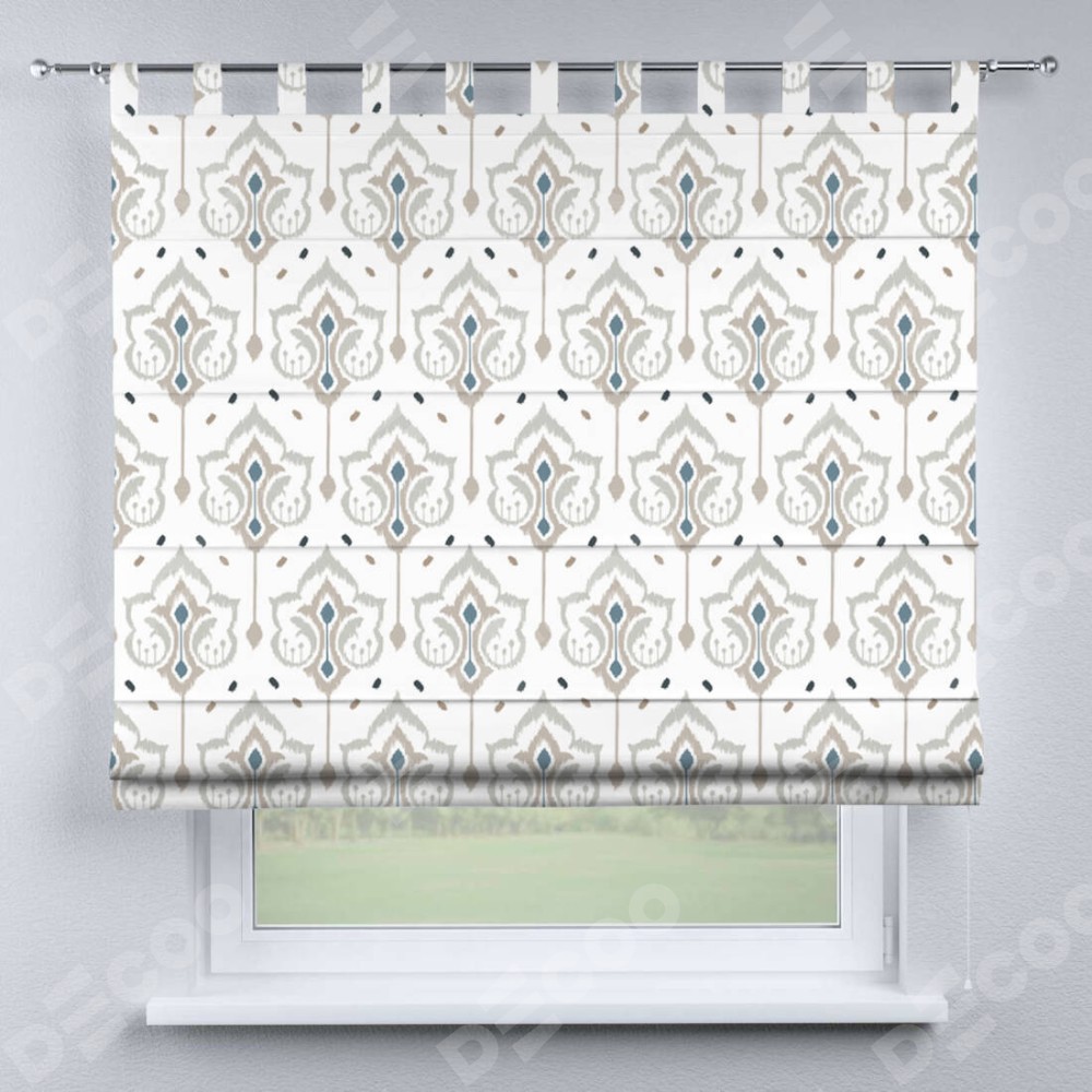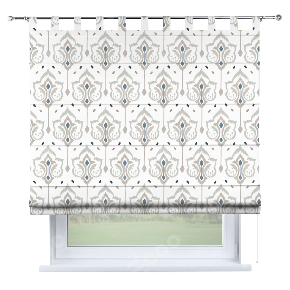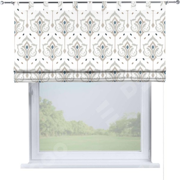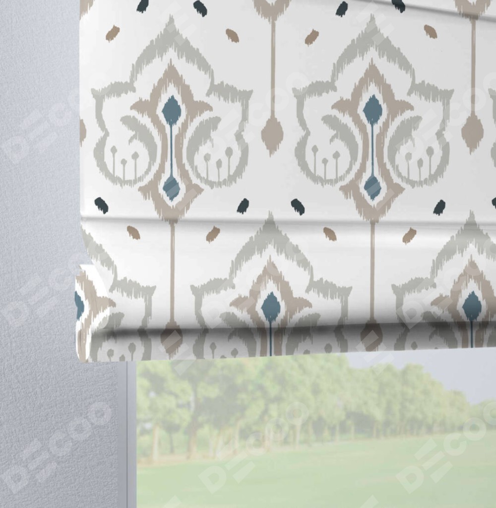 Римская штора производителя «Cortin», используется для проёма, пошита из ткани блэкаут с нанесением сублимационной печати «Икат узор». Данная модель пошита на петлях, комплектуется на выбор круглым карнизом и подходит для монтажа на стену. Римская штора на петлях имеет простую систему регулировки высоты, отличительным преимуществом данной модели является простой способ монтажа. Достаточно повесить ее на трубу и штора готова!
