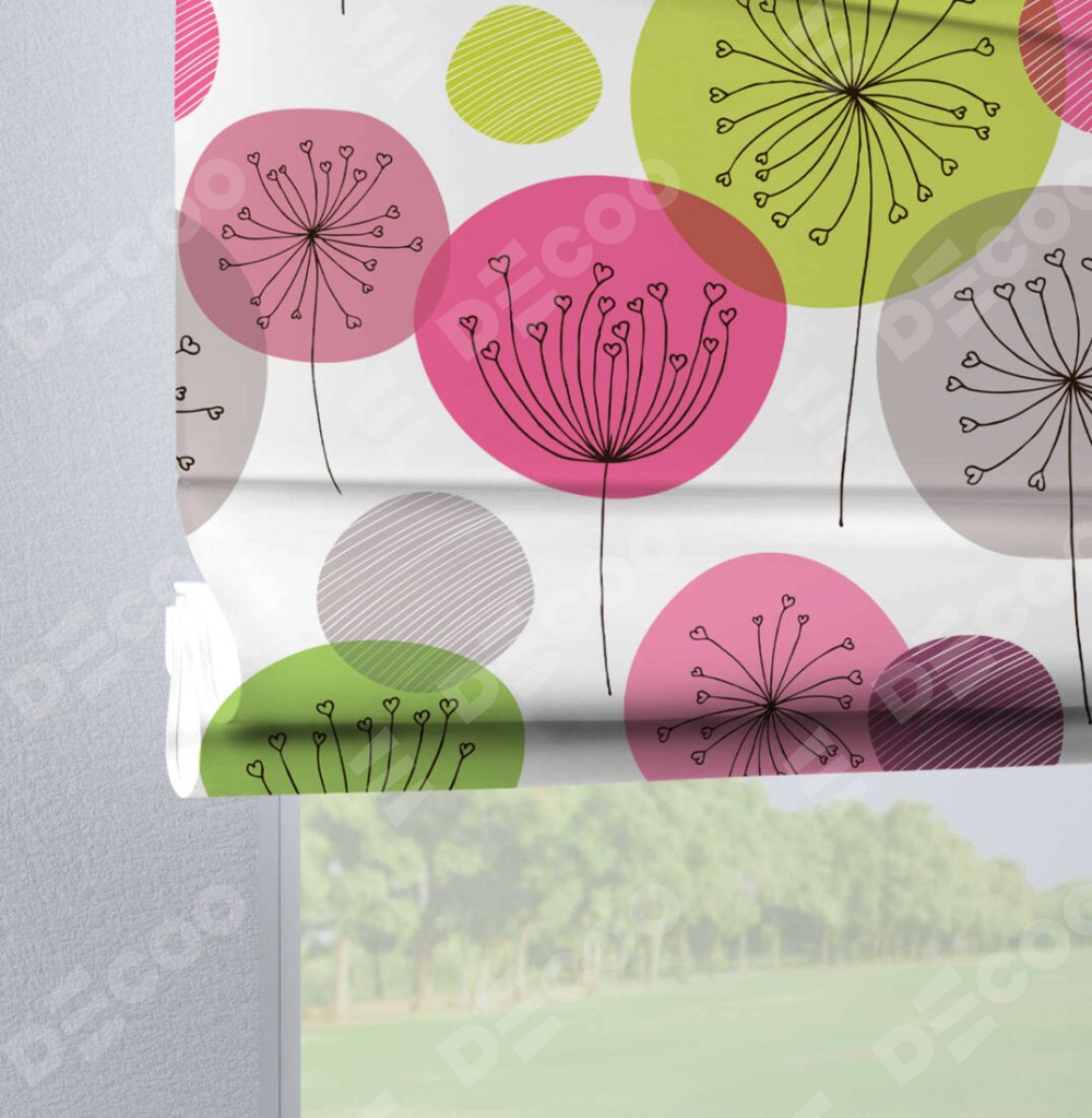 Римская штора производителя «Cortin», используется для проёма, пошита из ткани блэкаут с нанесением сублимационной печати «Цветные одуванчики». Данная модель пошита на петлях, комплектуется на выбор круглым карнизом и подходит для монтажа на стену. Римская штора на петлях имеет простую систему регулировки высоты, отличительным преимуществом данной модели является простой способ монтажа. Достаточно повесить ее на трубу и штора готова!