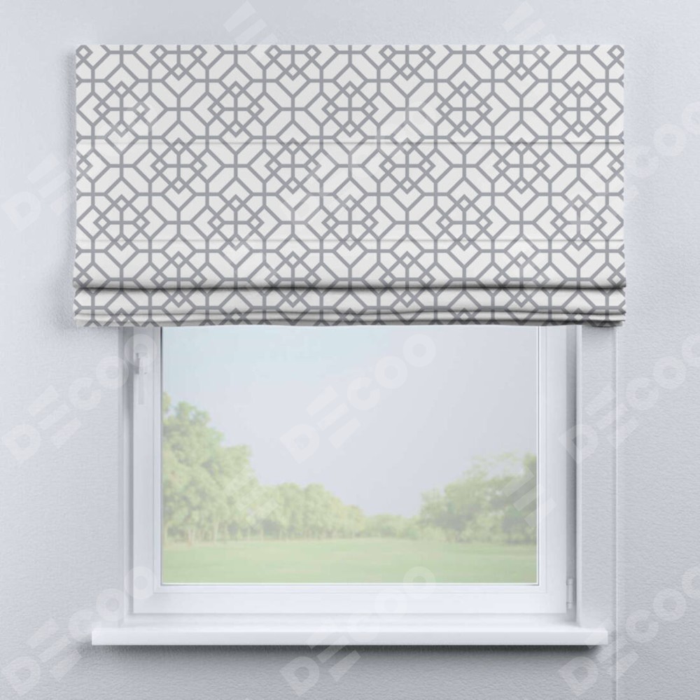 Римская штора производителя «Cortin», используется для проёма, пошита из ткани блэкаут с нанесением сублимационной печати «Архитектурный орнамент». Имеет универсальный механизм и подходит для монтажа: на потолок, на стену и в нишу.