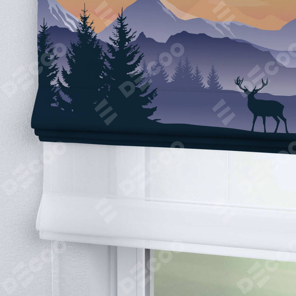 Римская штора день-ночь производителя «Cortin», используется для проёма, пошита из двух полотен, с лицевой блэкаут с нанесением сублимационной печати «Закат в горах», вторая ткань тюль (по стандарту комплектуется тюль белого цвета артикул V-01). Имеет универсальный механизм и подходит для монтажа: на потолок, на стену и в нишу.