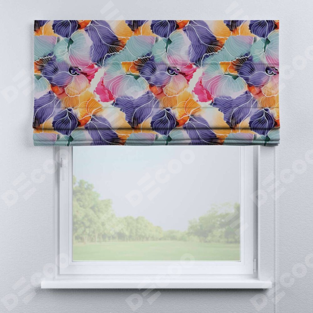 Римская штора производителя «Cortin», используется для проёма, пошита из ткани блэкаут с нанесением сублимационной печати «Роскошные ирисы». Имеет универсальный механизм и подходит для монтажа: на потолок, на стену и в нишу.