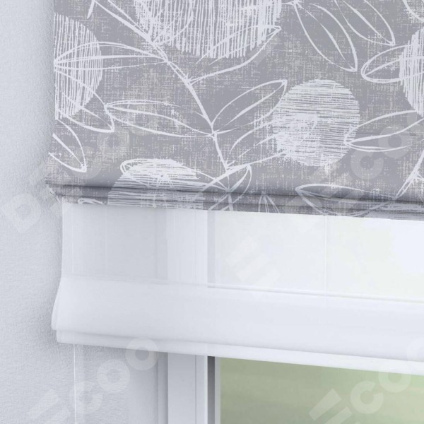 Римская штора день-ночь производителя «Cortin», используется для проёма, пошита из двух полотен, с лицевой блэкаут с нанесением сублимационной печати «Серо-белая фантазия», вторая ткань тюль (по стандарту комплектуется тюль белого цвета артикул V-01). Имеет универсальный механизм и подходит для монтажа: на потолок, на стену и в нишу.