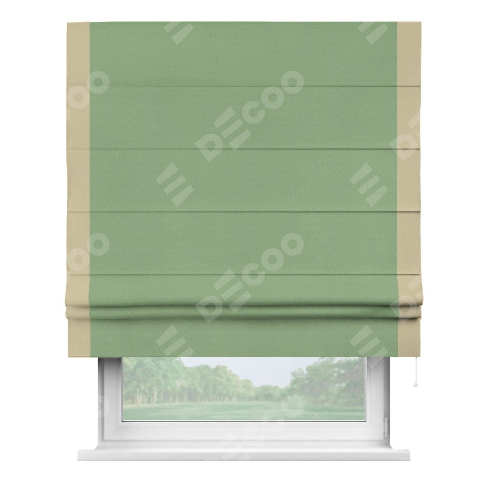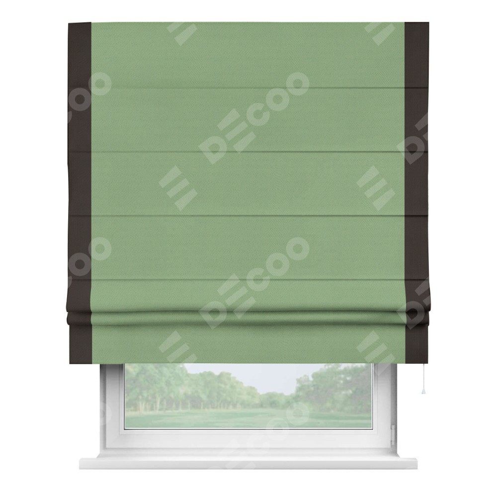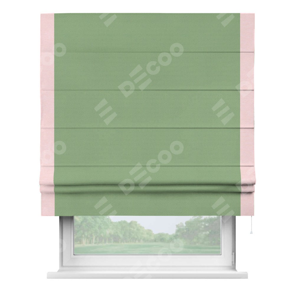 Римская штора производителя «Cortin», используется для проёма, пошита из ткани блэкаут однотонный оливковый, артикул ткани 88300. Отделка шторы кантом «Стрим Дуо», ткань для канта используется из блэкаута однотонного разной расцветки на выбор. Имеет универсальный механизм и подходит для монтажа: на потолок, на стену и в нишу.