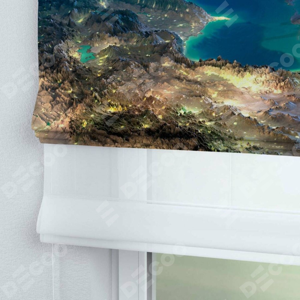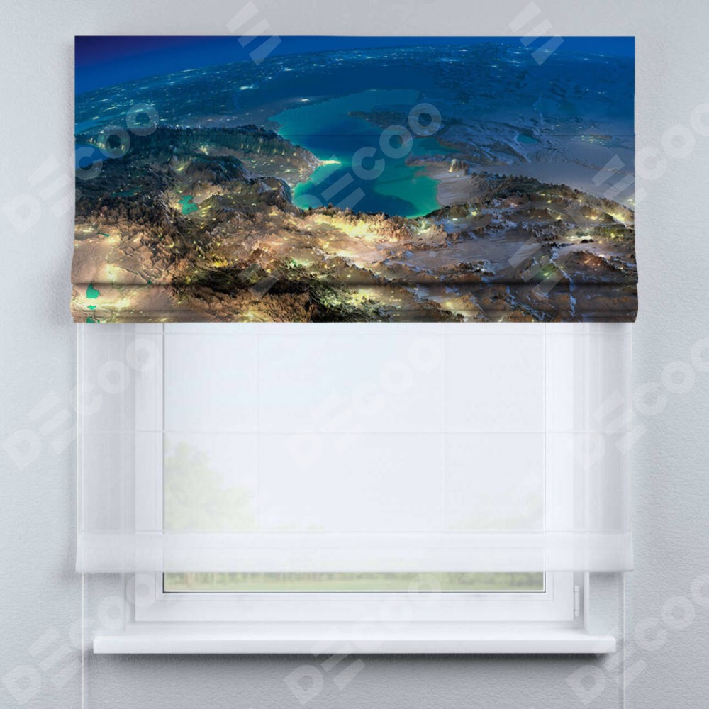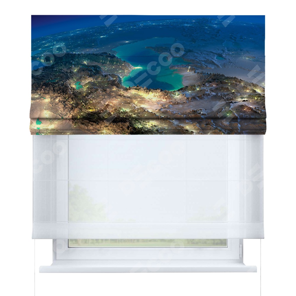 Римская штора день-ночь производителя «Cortin», используется для проёма, пошита из двух полотен, с лицевой блэкаут с нанесением сублимационной печати «Ночные огни», вторая ткань тюль (по стандарту комплектуется тюль белого цвета артикул V-01). Имеет универсальный механизм и подходит для монтажа: на потолок, на стену и в нишу.