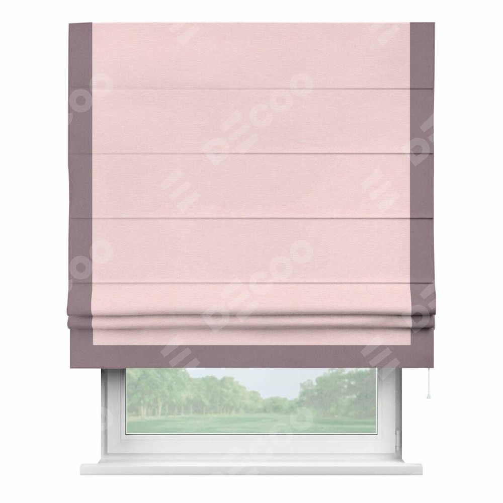 Римская штора производителя «Cortin», используется для проёма, пошита из ткани блэкаут однотонный розовый, артикул ткани 83046. Отделка шторы кантом «Виктория», ткань для канта используется из блэкаута однотонного разной расцветки на выбор. Имеет универсальный механизм и подходит для монтажа: на потолок, на стену и в нишу.