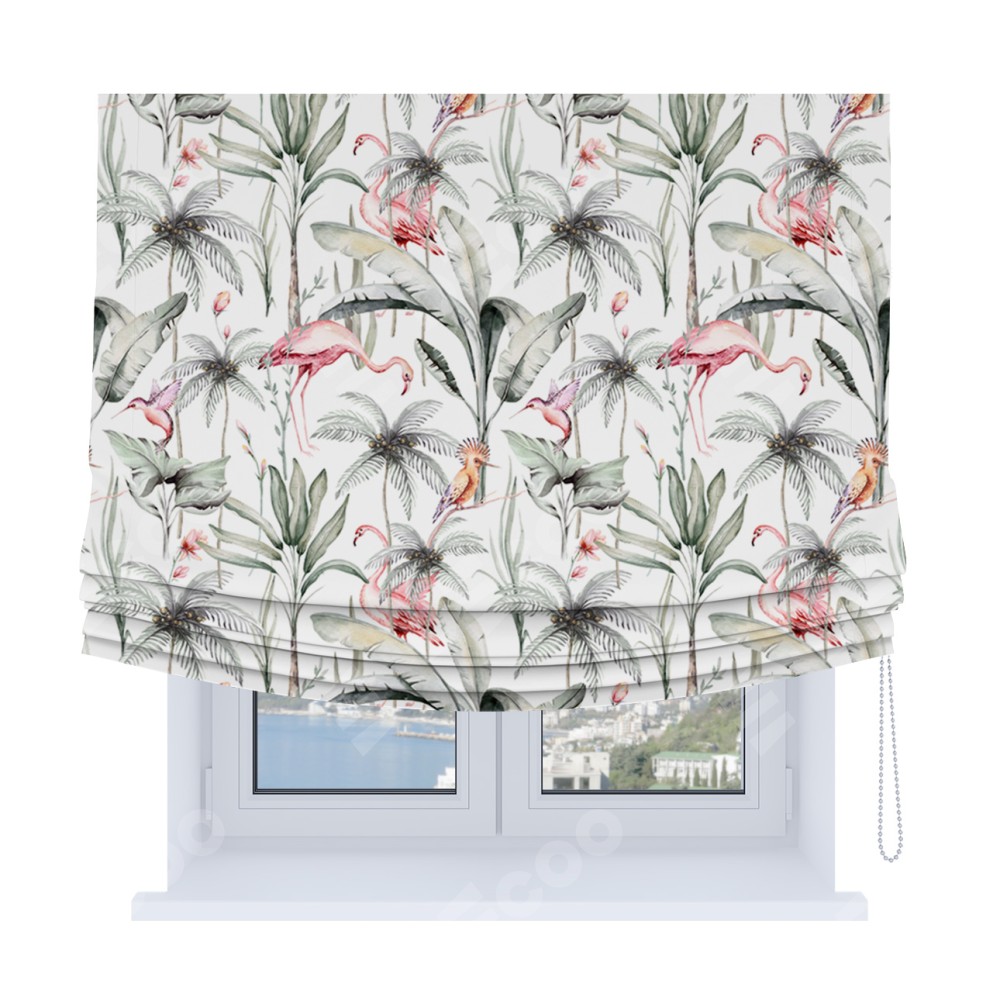 Римская штора Soft производителя «Cortin», используется для проёма, пошита из ткани блэкаут с нанесением сублимационной печати «Изящные фламинго». Имеет универсальный механизм и подходит для монтажа: на потолок, на стену и в нишу. В отличие от стандартных римских штор, римская штора Soft не имеет горизонтальных вставок и нижнего отвеса. Это позволяет ткани произвольно драпироваться в свободные мягкие складки.