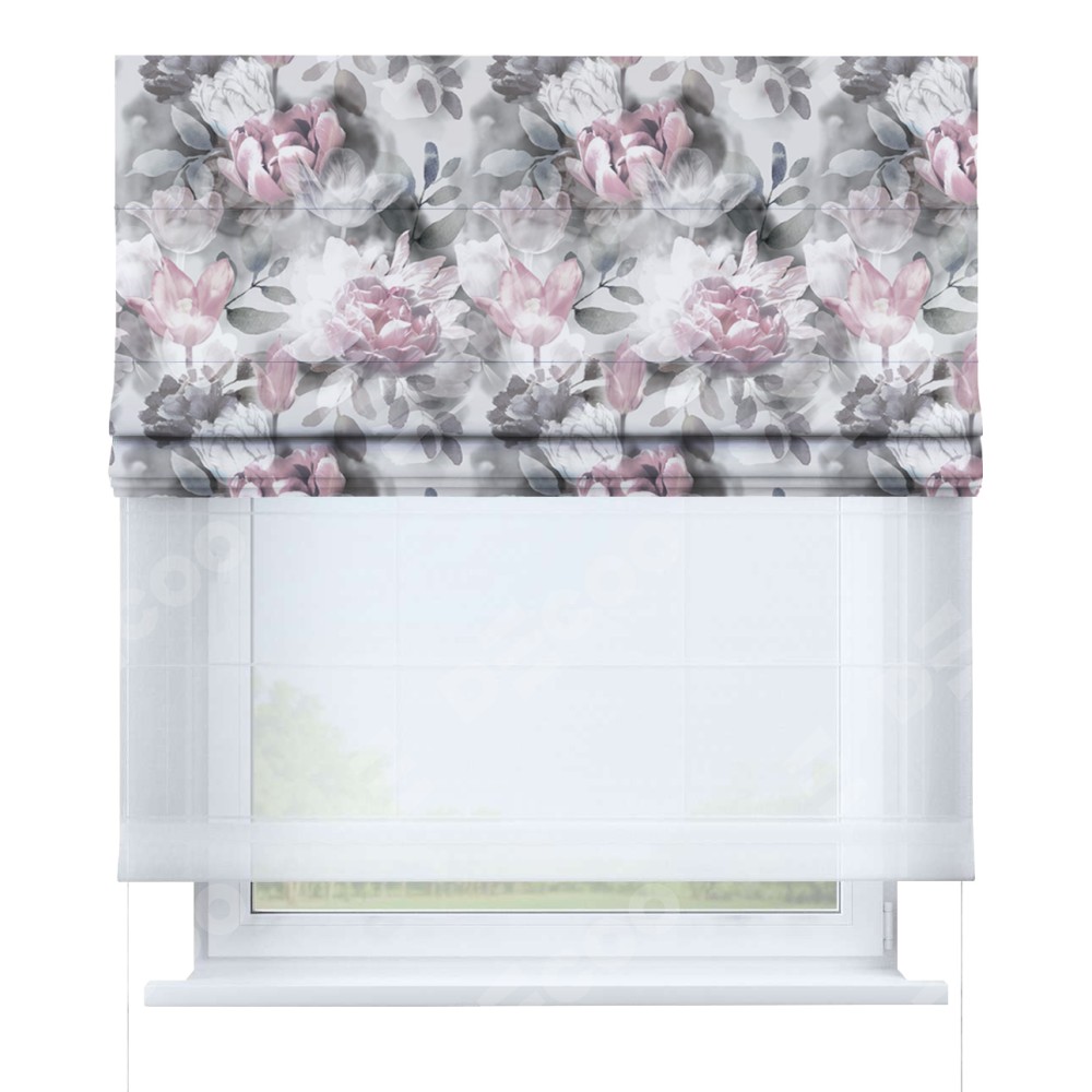 Римская штора день-ночь производителя «Cortin», используется для проёма, пошита из двух полотен, с лицевой блэкаут с нанесением сублимационной печати «Цветочная композиция», вторая ткань тюль (по стандарту комплектуется тюль белого цвета артикул V-01). Имеет универсальный механизм и подходит для монтажа: на потолок, на стену и в нишу.