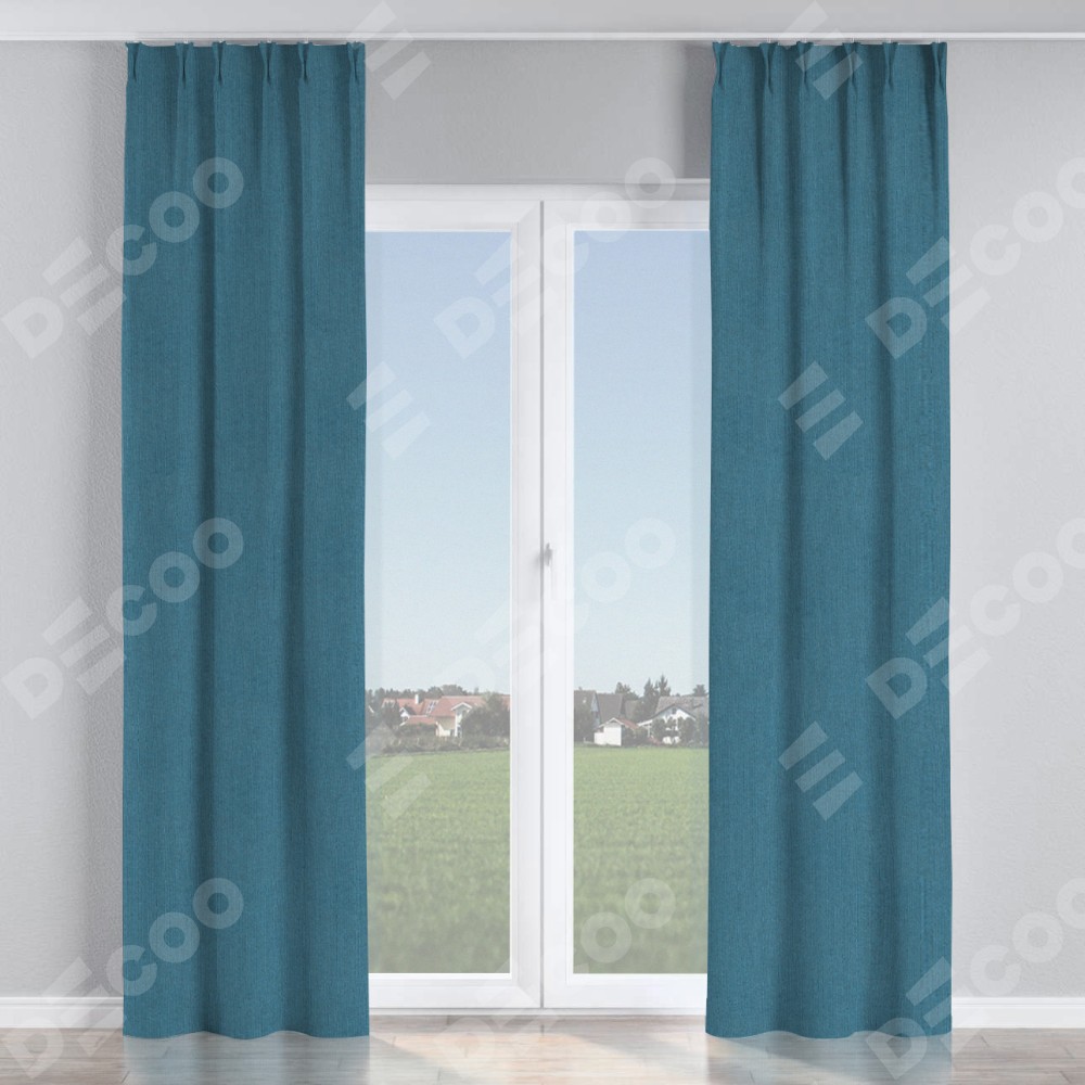 Комплект прямых штор, от производителя «Cortin», пошиты из ткани лён блэкаут синий, артикул ткани 69528. С изнаночной стороны в верхней части штор пристрачивается шторная лента с декоративными складками «Кустик». Для создания элегантных складок прямые шторы шьются по стандарту с коэффициентом 1:2 (на 100 см. ширины проёма 200 см. ширины ткани).
