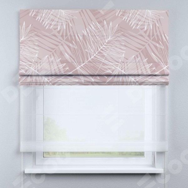 Римская штора день-ночь производителя «Cortin», используется для проёма, пошита из двух полотен, с лицевой блэкаут с нанесением сублимационной печати «Бежевые тропики», вторая ткань тюль (по стандарту комплектуется тюль белого цвета артикул V-01). Имеет универсальный механизм и подходит для монтажа: на потолок, на стену и в нишу.