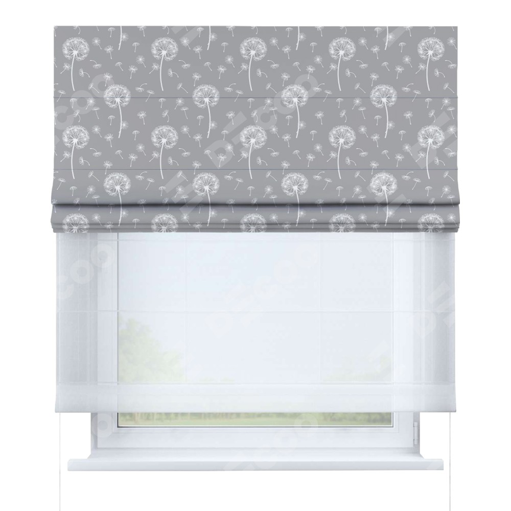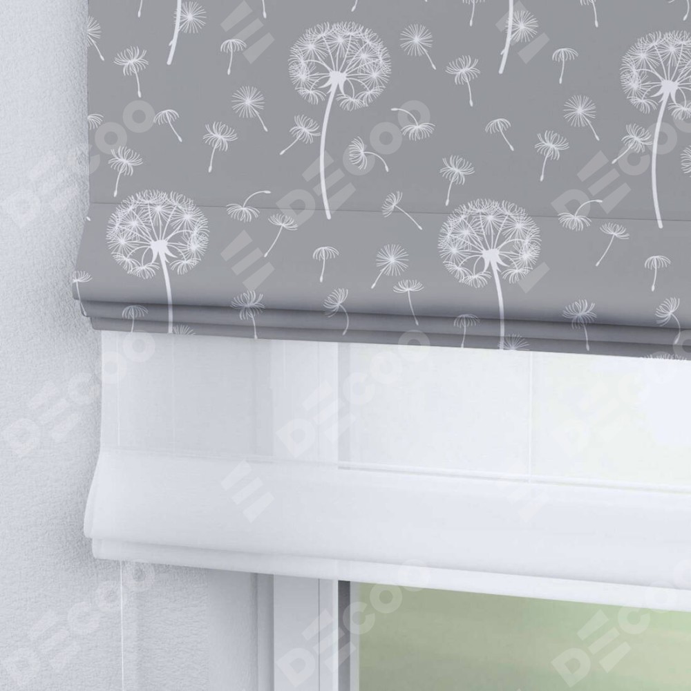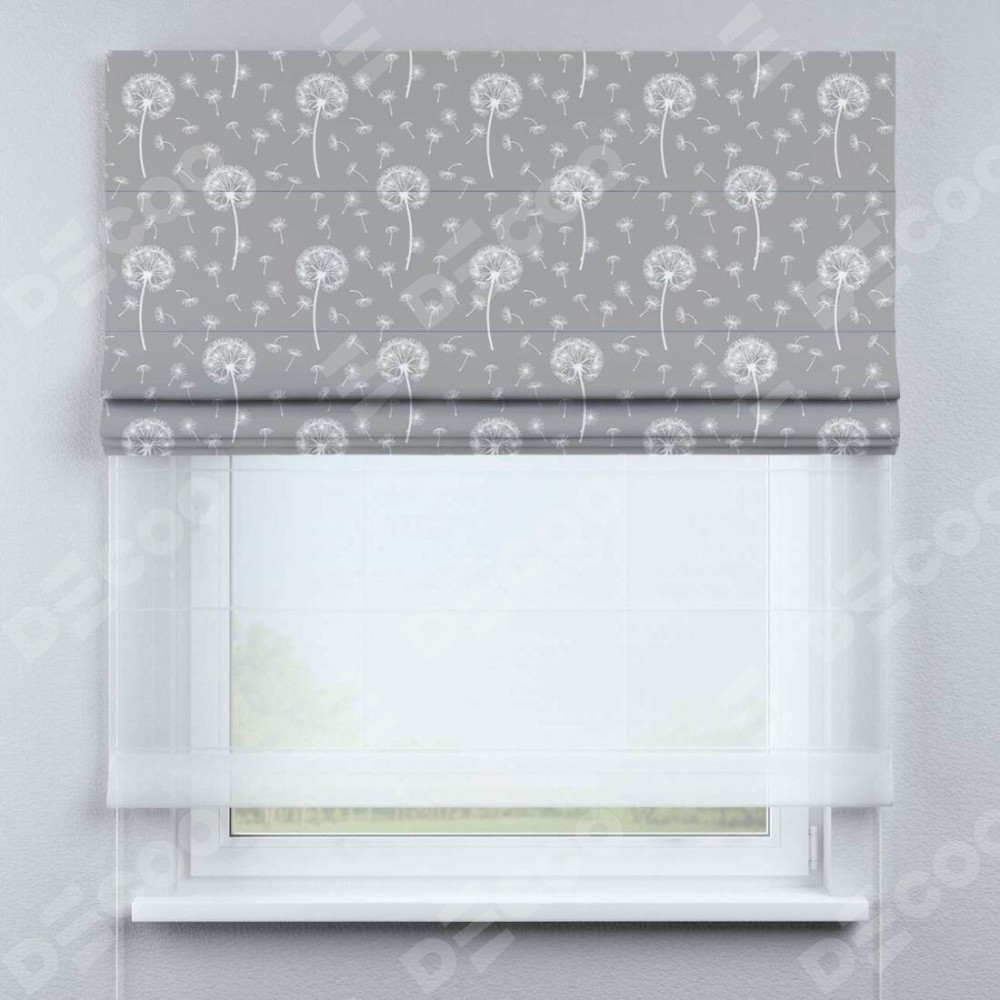 Римская штора день-ночь производителя «Cortin», используется для проёма, пошита из двух полотен, с лицевой блэкаут с нанесением сублимационной печати «Одуванчики», вторая ткань тюль (по стандарту комплектуется тюль белого цвета артикул V-01). Имеет универсальный механизм и подходит для монтажа: на потолок, на стену и в нишу.