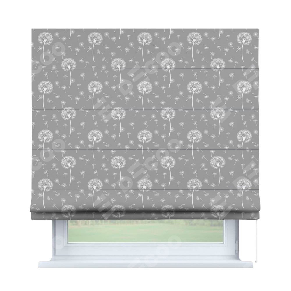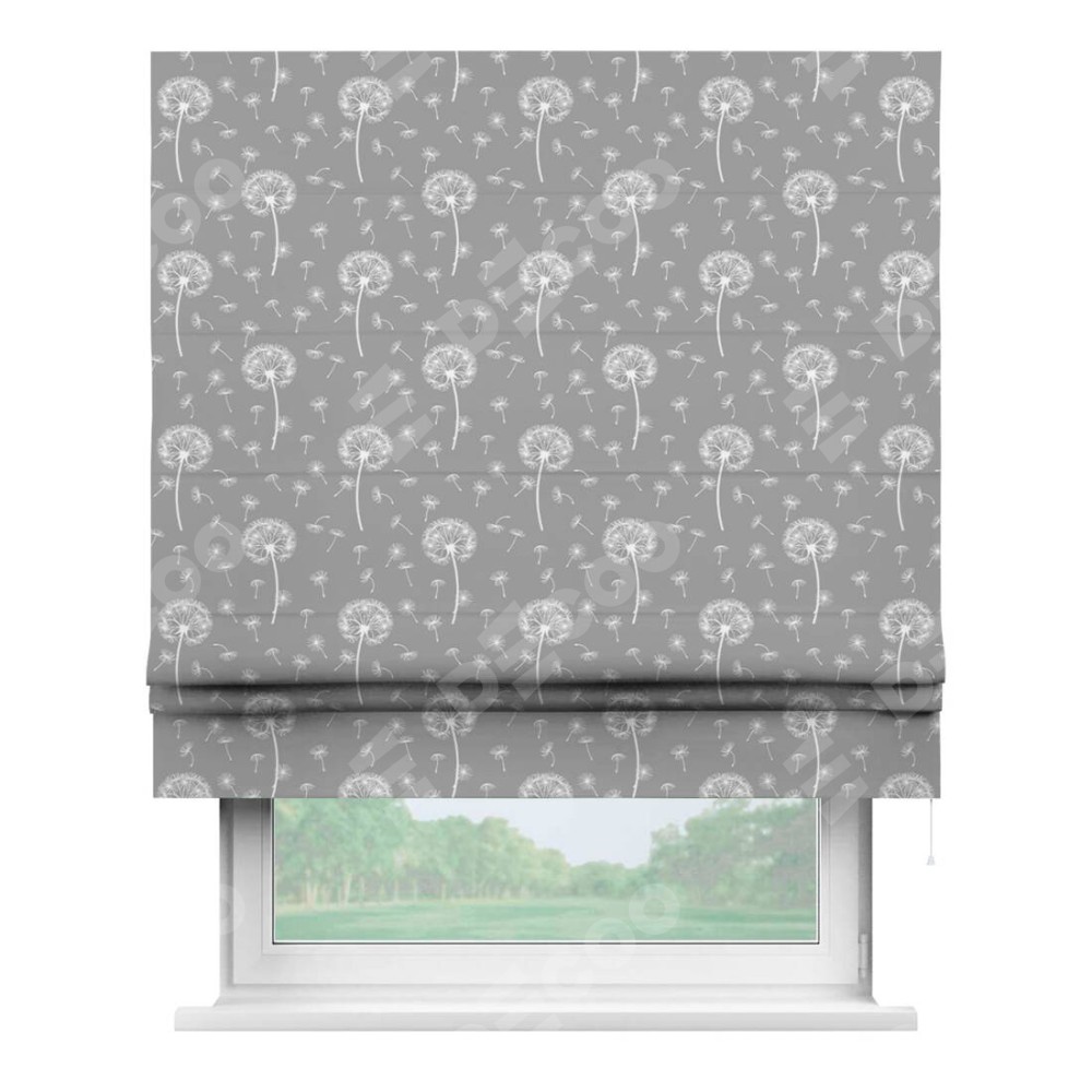 Римская штора производителя «Cortin», используется для проёма, пошита из ткани блэкаут с нанесением сублимационной печати «Одуванчики». Имеет универсальный механизм и подходит для монтажа: на потолок, на стену и в нишу.