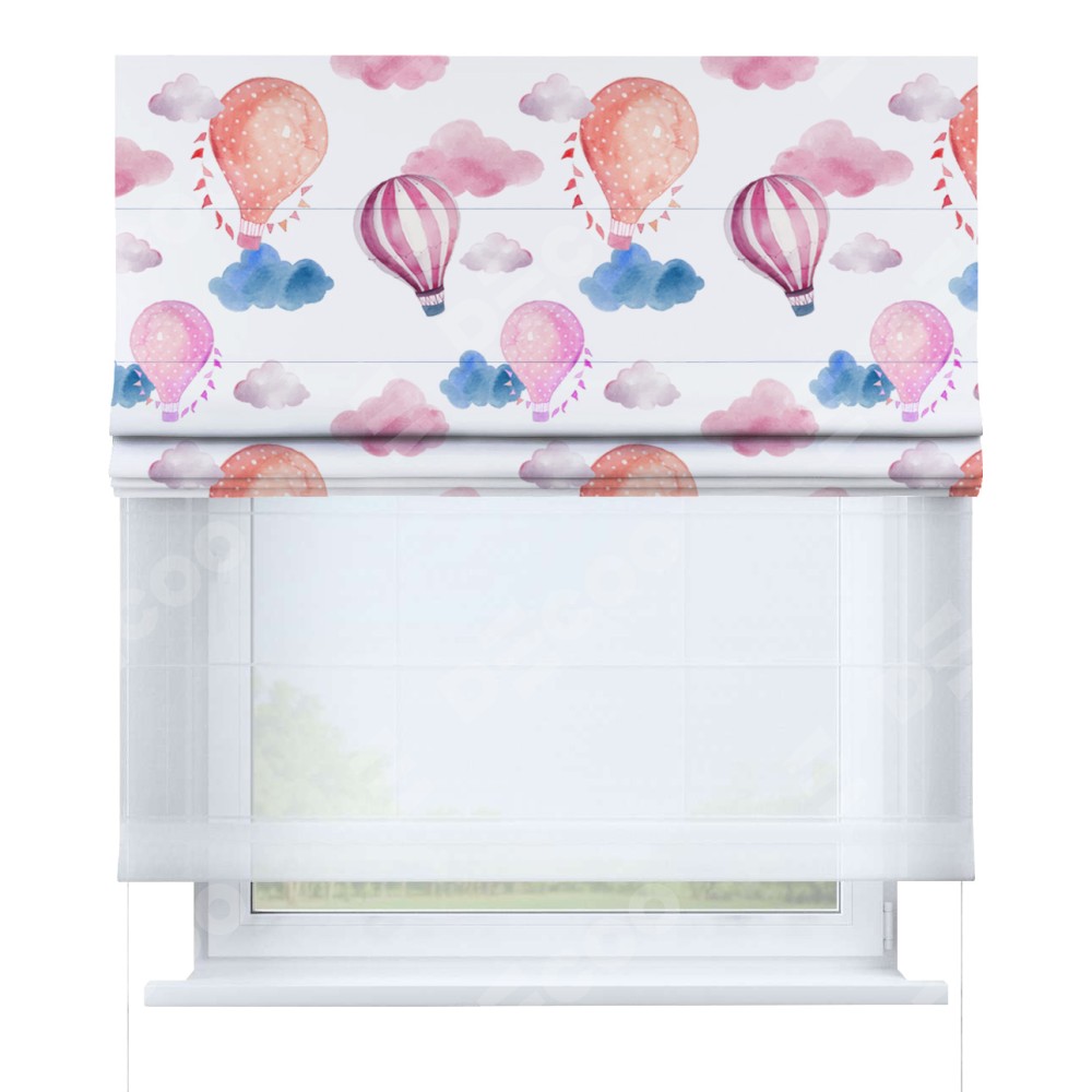 Римская штора день-ночь производителя «Cortin», используется для проёма, пошита из двух полотен, с лицевой блэкаут с нанесением сублимационной печати «Полёт в облаках», вторая ткань тюль (по стандарту комплектуется тюль белого цвета артикул V-01). Имеет универсальный механизм и подходит для монтажа: на потолок, на стену и в нишу.