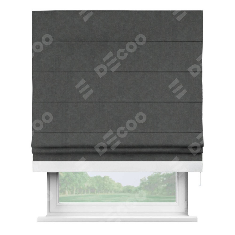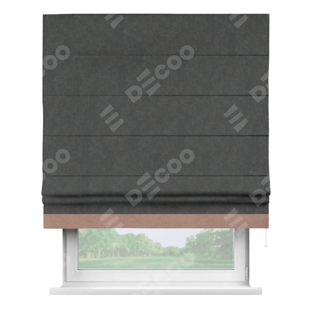 Римская штора производителя «Cortin», используется для проёма, пошита из ткани вельвет тёмно-серый, артикул ткани 33811. Отделка шторы кантом «Джестер», ткань для канта используется из вельвета разной расцветки на выбор. Имеет универсальный механизм и подходит для монтажа: на потолок, на стену и в нишу.
