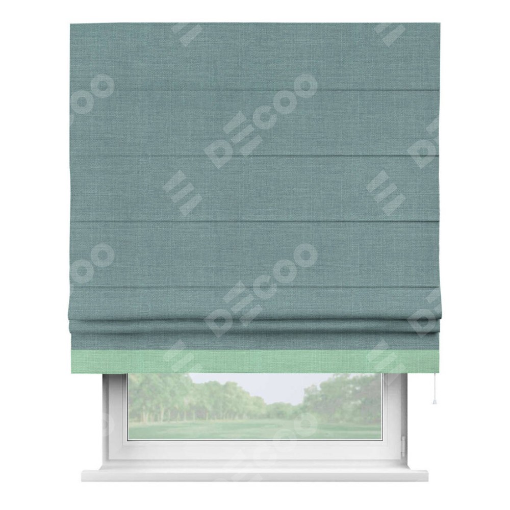 Римская штора производителя «Cortin», используется для проёма, пошита из ткани лён голубой, артикул 74736. Отделка шторы кантом «Джестер», ткань для канта используется из льна разной расцветки на выбор. Имеет универсальный механизм и подходит для монтажа: на потолок, на стену и в нишу.