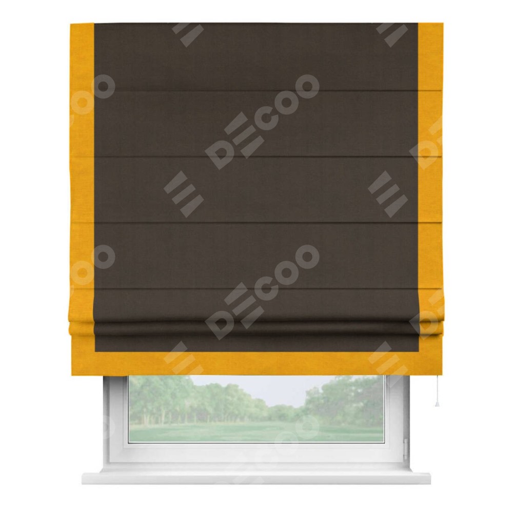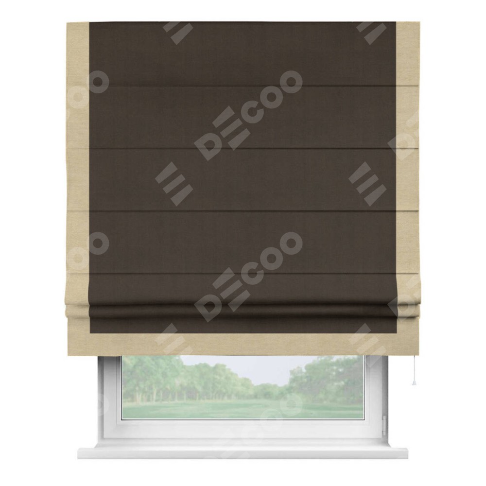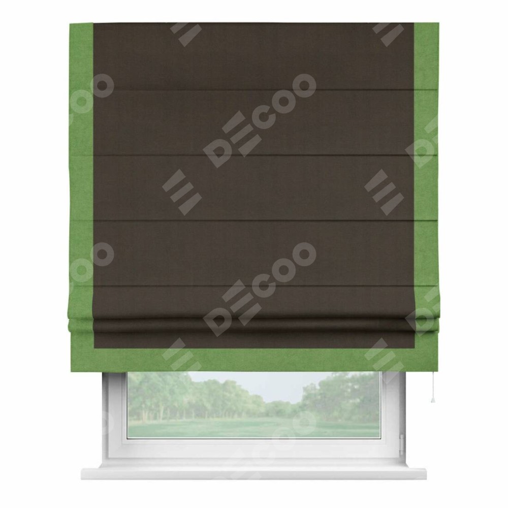 Римская штора производителя «Cortin», используется для проёма, пошита из ткани вельвет тёмно-коричневый, артикул ткани 30991. Отделка шторы кантом «Виктория», ткань для канта используется из вельвета разной расцветки на выбор. Имеет универсальный механизм и подходит для монтажа: на потолок, на стену и в нишу.
