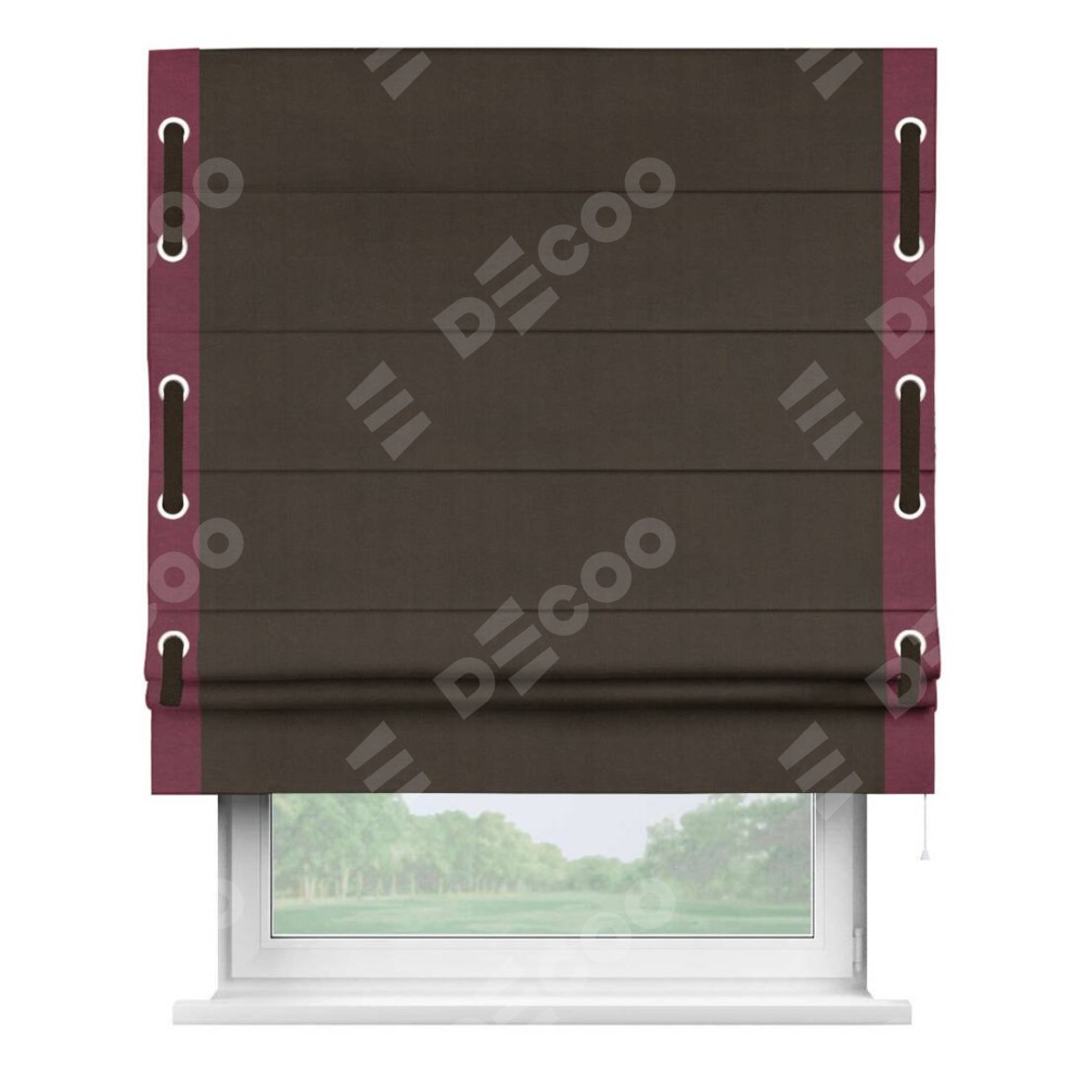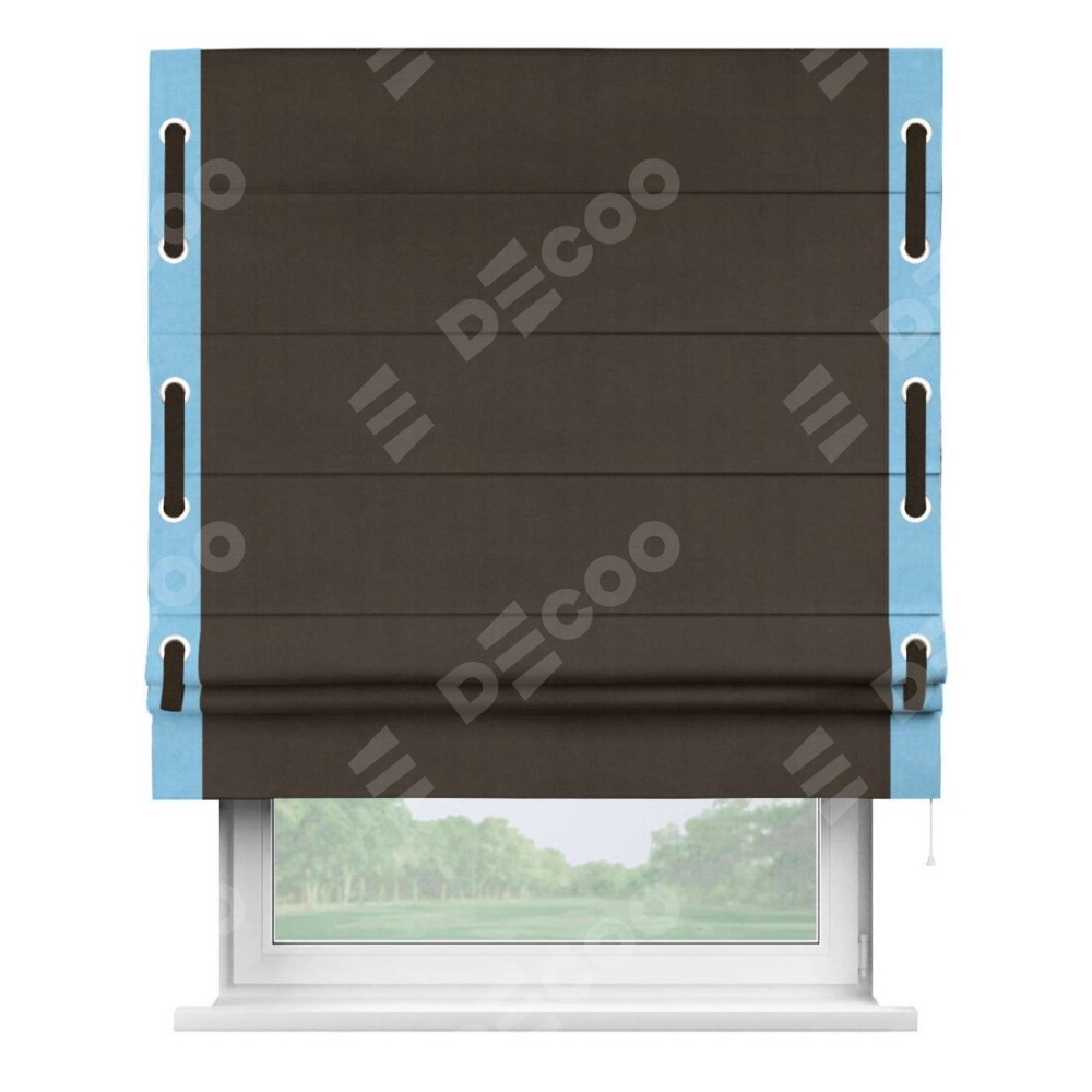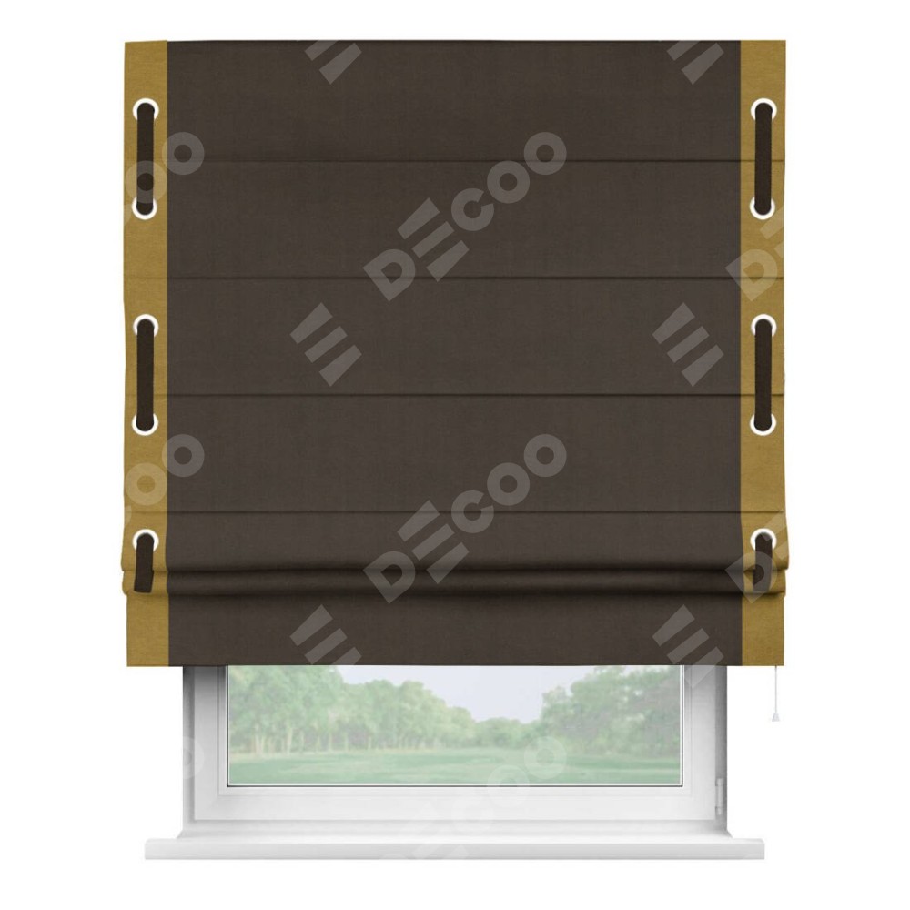 Римская штора производителя «Cortin», используется для проёма, пошита из ткани вельвет тёмно-коричневый, артикул ткани 30991. Отделка шторы кантом «Стрим Дуо» на кантах расположены люверсы с пояском, ткань для канта используется из вельвета разной расцветки на выбор. Ткань для пояска обычно используется из основной ткани шторы, а так же можно сделать из любой расцветки по желанию. Имеет универсальный механизм и подходит для монтажа: на потолок, на стену и в нишу.