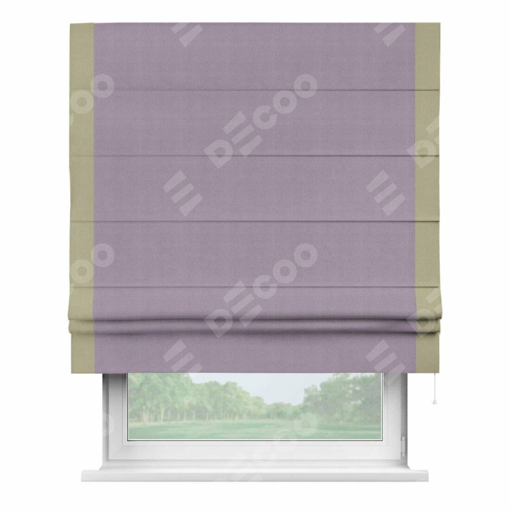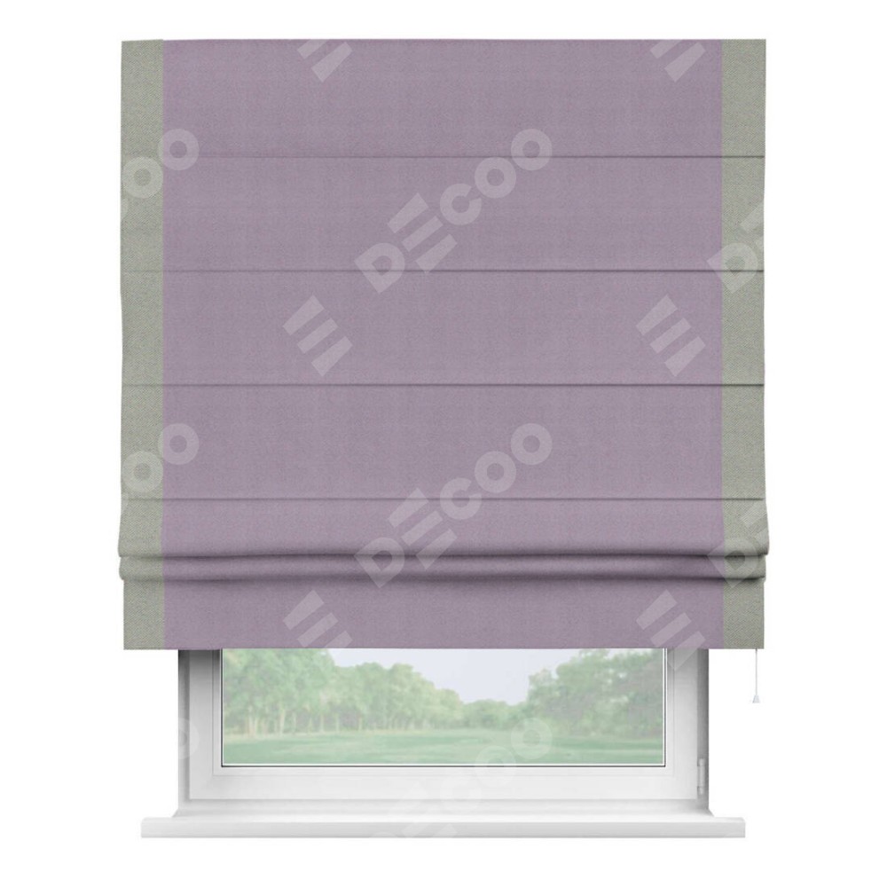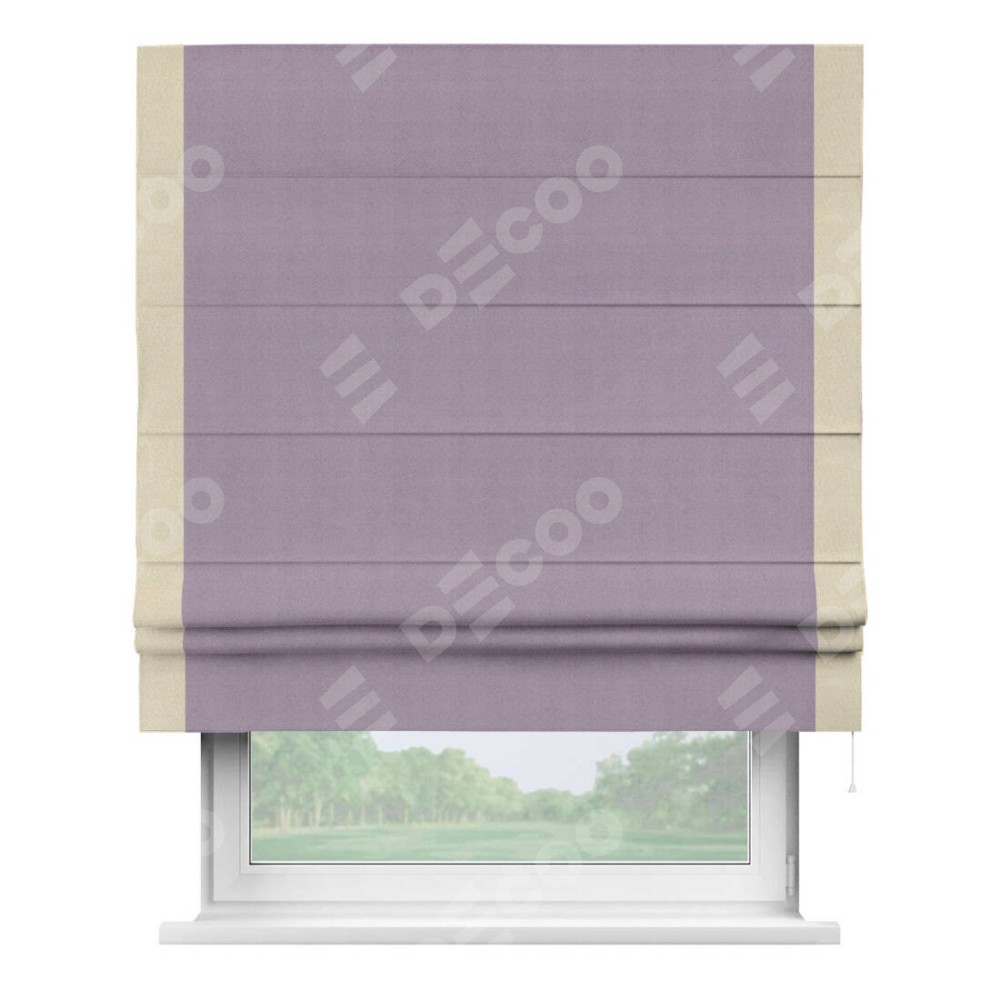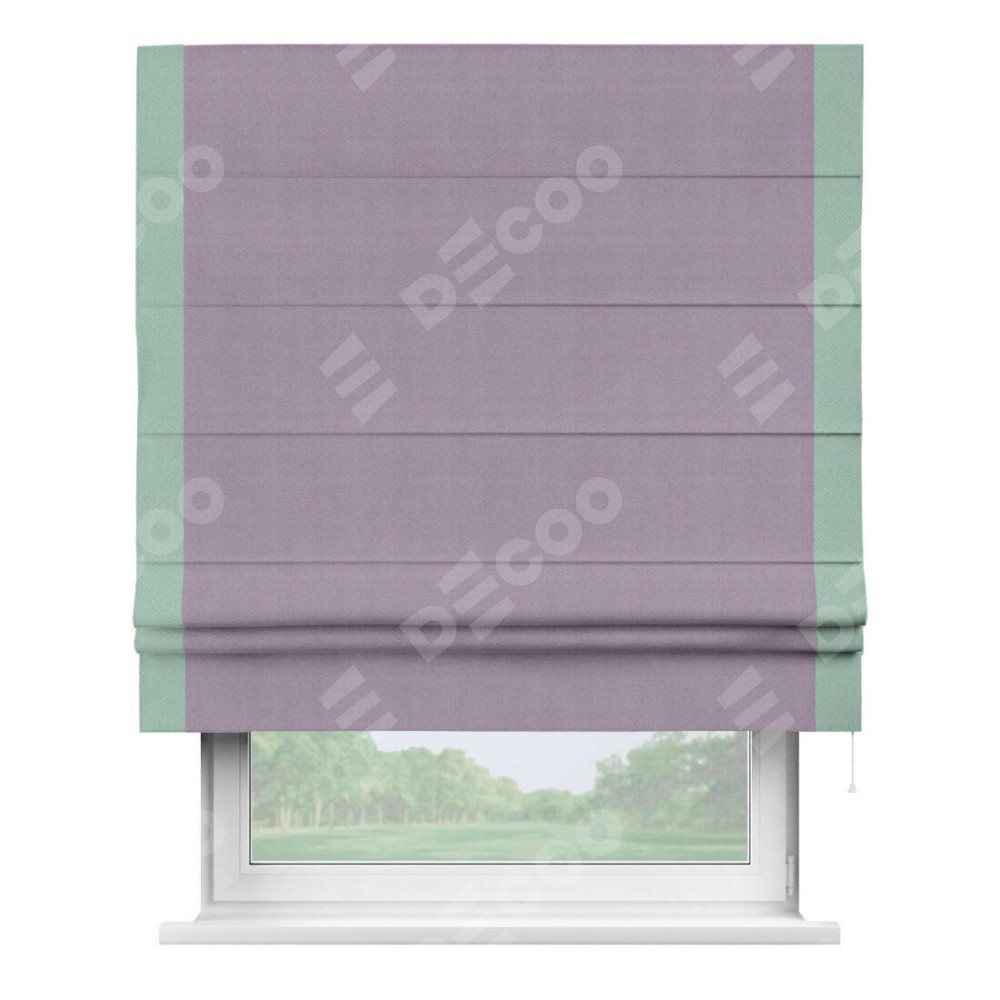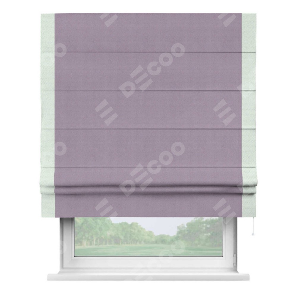 Римская штора производителя «Cortin», используется для проёма, пошита из ткани блэкаут однотонный светло-сиреневый, артикул ткани 29333−1. Отделка шторы кантом «Стрим Дуо», ткань для канта используется из блэкаута однотонного разной расцветки на выбор. Имеет универсальный механизм и подходит для монтажа: на потолок, на стену и в нишу.