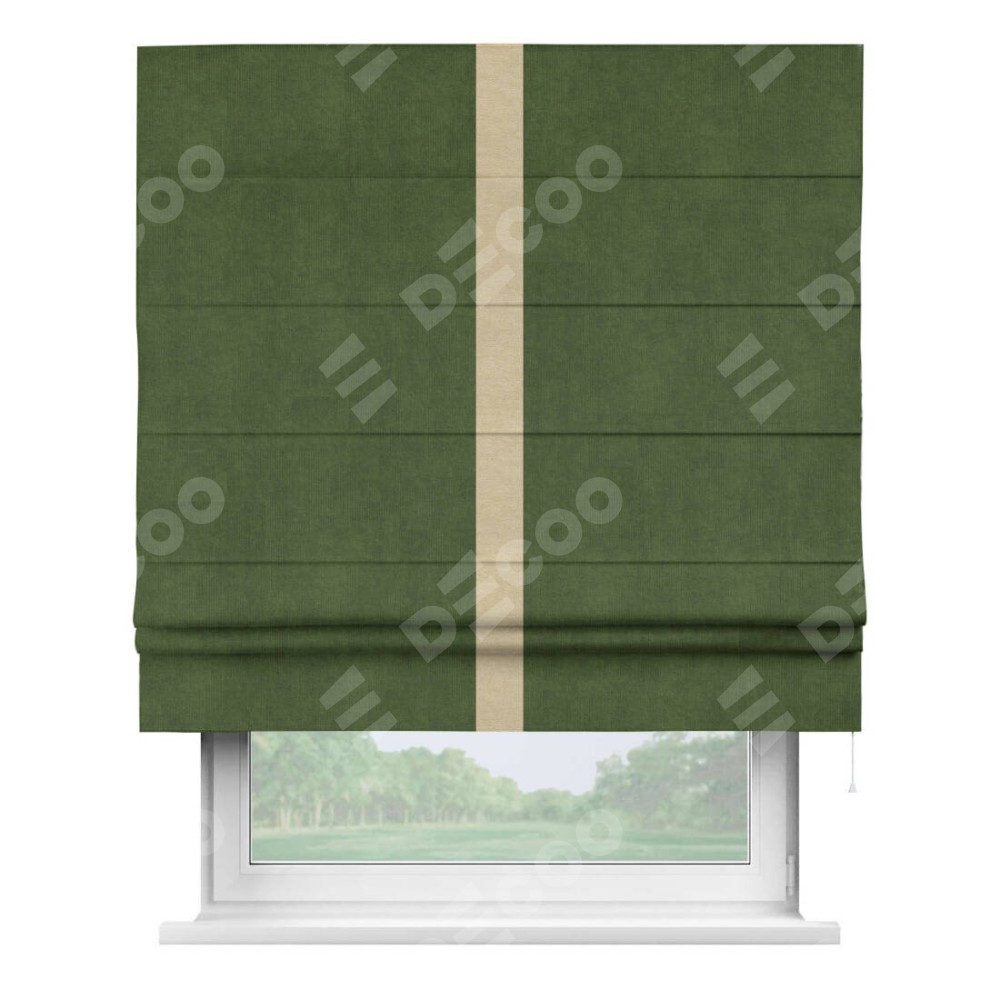 Римская штора производителя «Cortin», используется для проёма, пошита из ткани вельвет тёмно-салатовый, артикул ткани 33805. Отделка шторы кантом «Хайвей», ткань для канта используется из вельвета разной расцветки на выбор. Имеет универсальный механизм и подходит для монтажа: на потолок, на стену и в нишу.