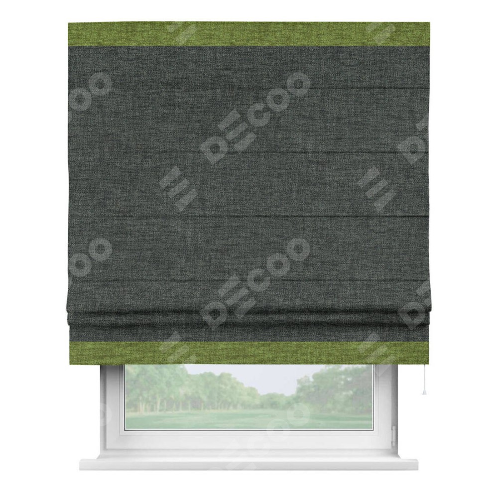 Римская штора производителя «Cortin», используется для проёма, пошита из ткани рогожка димаут графит, артикул 102−34. Отделка шторы кантом «Горизонт», ткань для канта используется из рогожки димаут разной расцветки на выбор. Имеет универсальный механизм и подходит для монтажа: на потолок, на стену и в нишу.