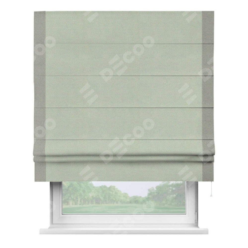 Римская штора производителя «Cortin», используется для проёма, пошита из ткани блэкаут однотонный светло-серый, артикул ткани 29332−2. Отделка шторы кантом «Стрим Дуо», ткань для канта используется из блэкаута однотонного разной расцветки на выбор. Имеет универсальный механизм и подходит для монтажа: на потолок, на стену и в нишу.