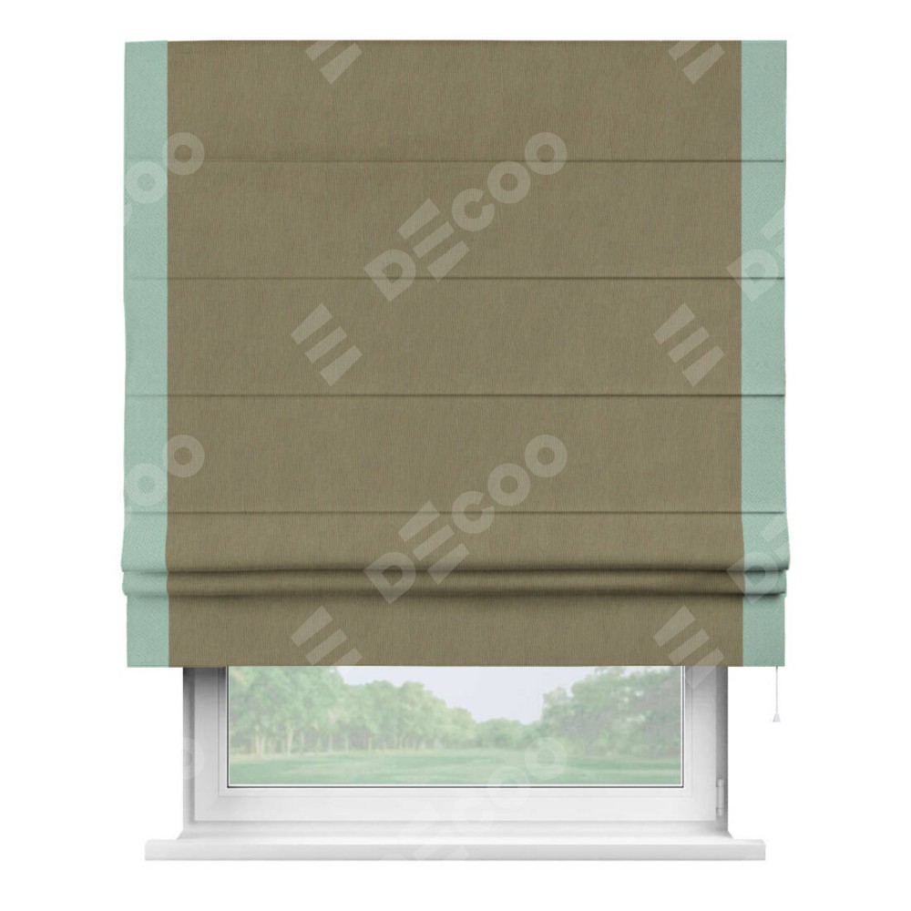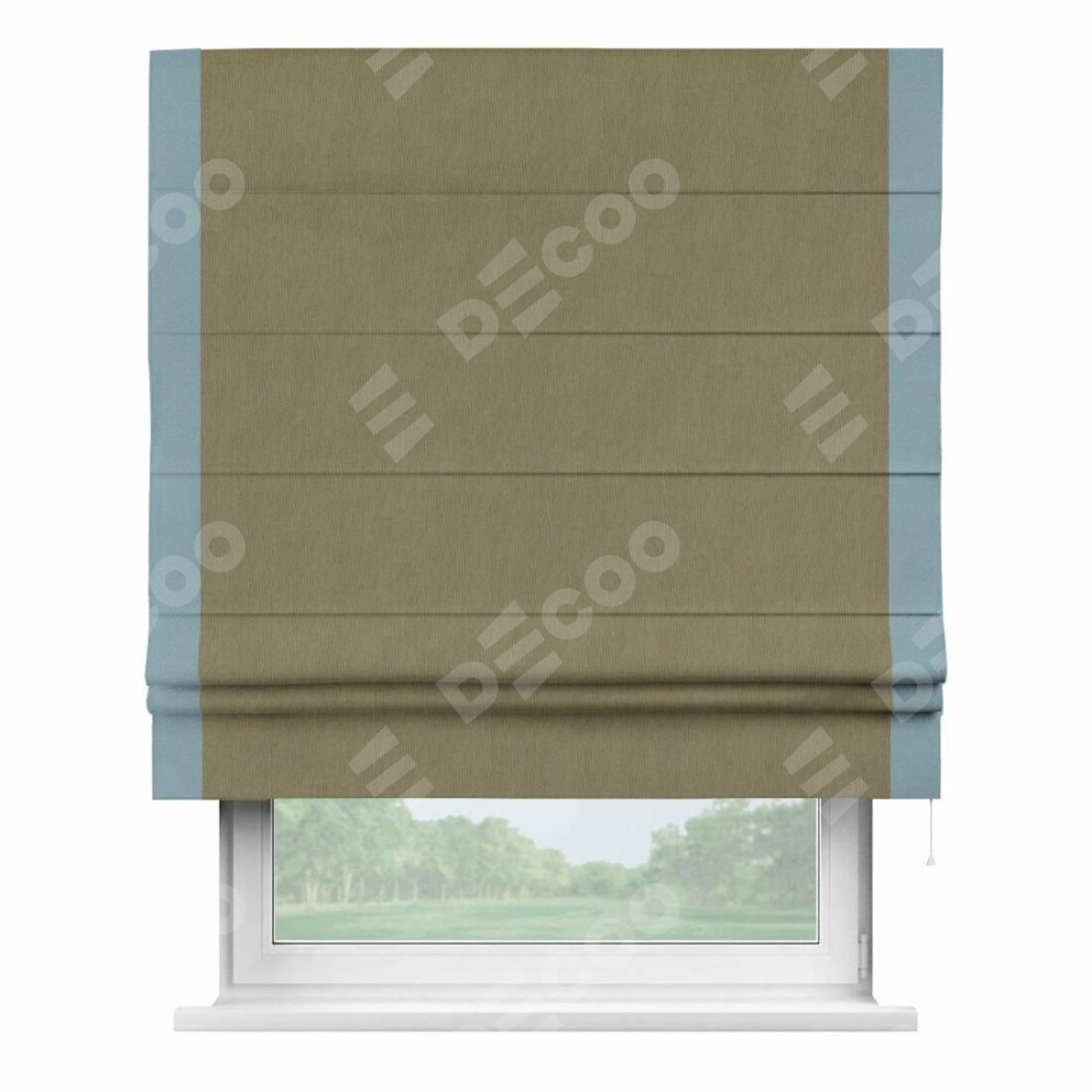 Римская штора производителя «Cortin», используется для проёма, пошита из ткани блэкаут однотонный бежево-золотой, артикул ткани 12095−2. Отделка шторы кантом «Стрим Дуо», ткань для канта используется из блэкаута однотонного разной расцветки на выбор. Имеет универсальный механизм и подходит для монтажа: на потолок, на стену и в нишу.