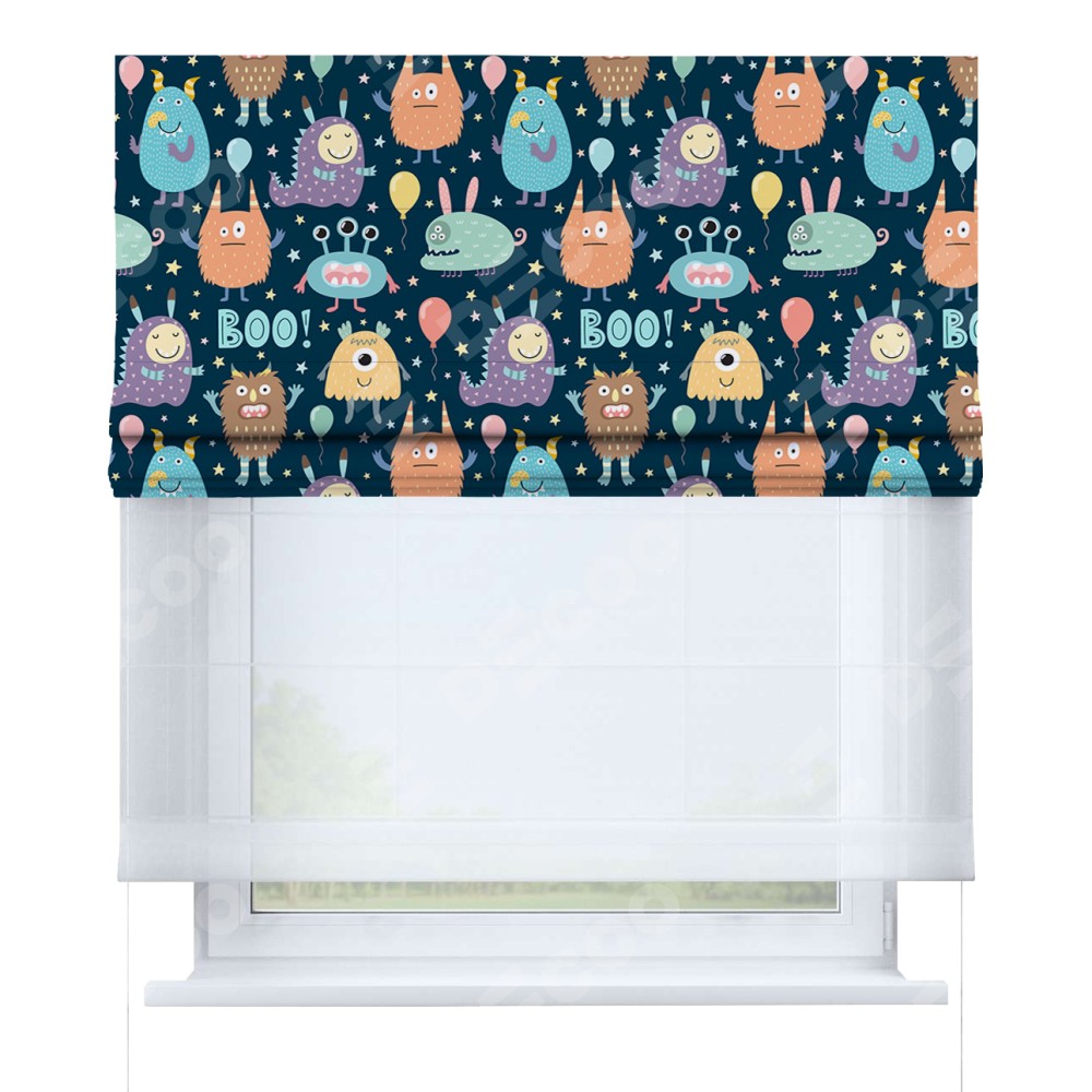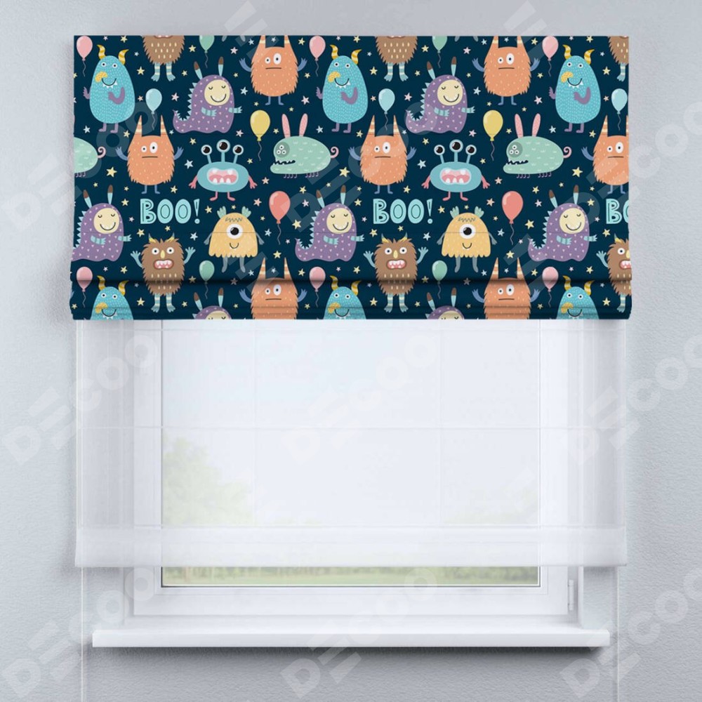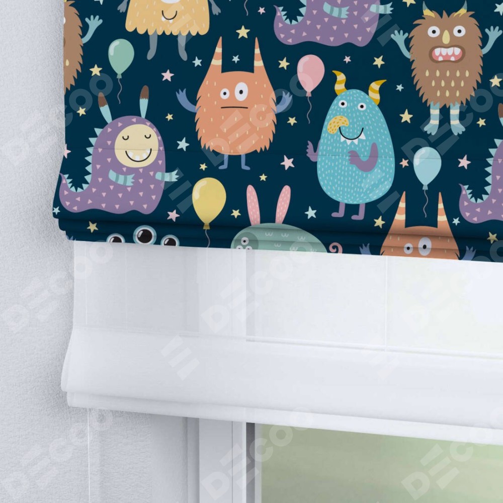 Римская штора день-ночь производителя «Cortin», используется для проёма, пошита из двух полотен, с лицевой блэкаут с нанесением сублимационной печати «Звёздные страшилки», вторая ткань тюль (по стандарту комплектуется тюль белого цвета артикул V-01). Имеет универсальный механизм и подходит для монтажа: на потолок, на стену и в нишу.