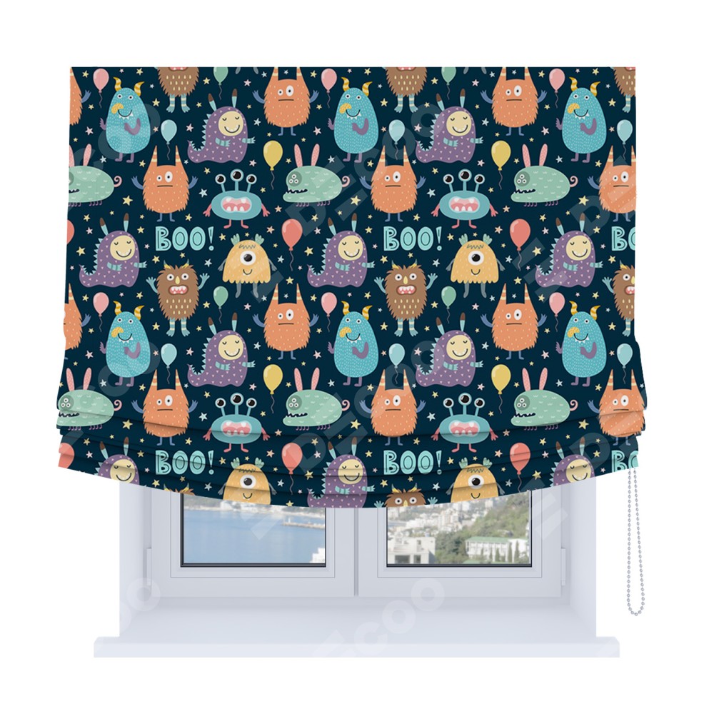 Римская штора Soft производителя «Cortin», используется для проёма, пошита из ткани блэкаут с нанесением сублимационной печати «Звёздные страшилки». Имеет универсальный механизм и подходит для монтажа: на потолок, на стену и в нишу. В отличие от стандартных римских штор, римская штора Soft не имеет горизонтальных вставок и нижнего отвеса. Это позволяет ткани произвольно драпироваться в свободные мягкие складки.