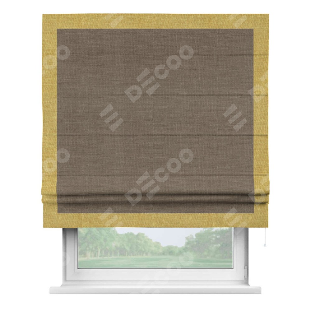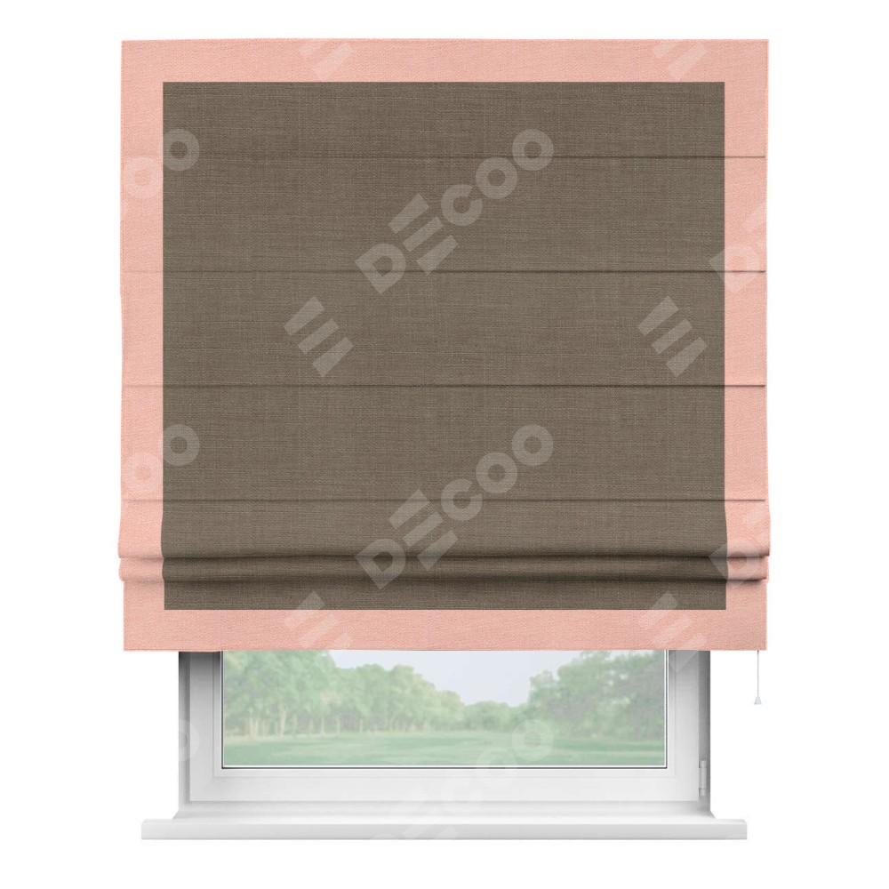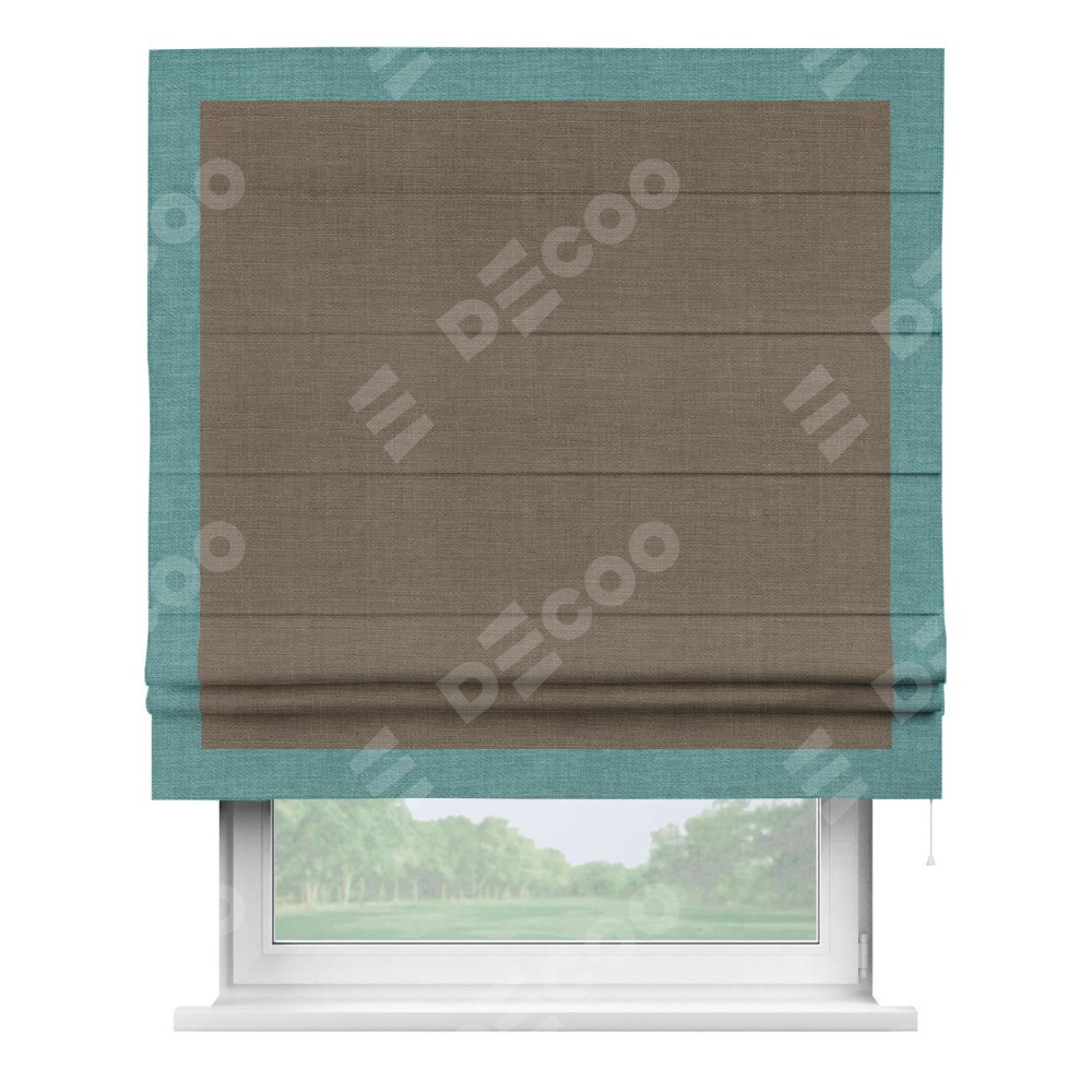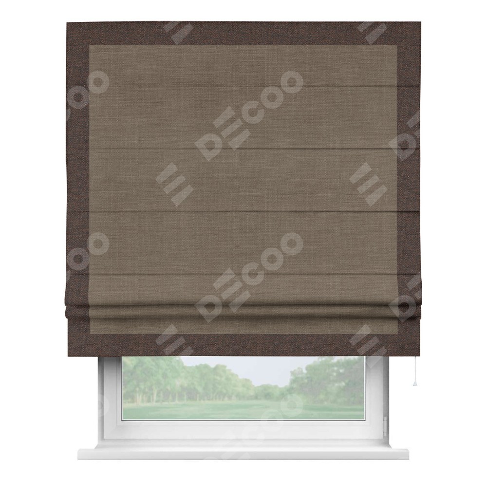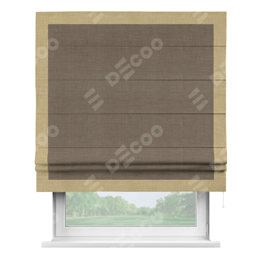 Римская штора производителя «Cortin», используется для проёма, пошита из ткани лён мокко, артикул 7444. Отделка шторы кантом «Чесс», ткань для канта используется из льна разной расцветки на выбор. Имеет универсальный механизм и подходит для монтажа: на потолок, на стену и в нишу.