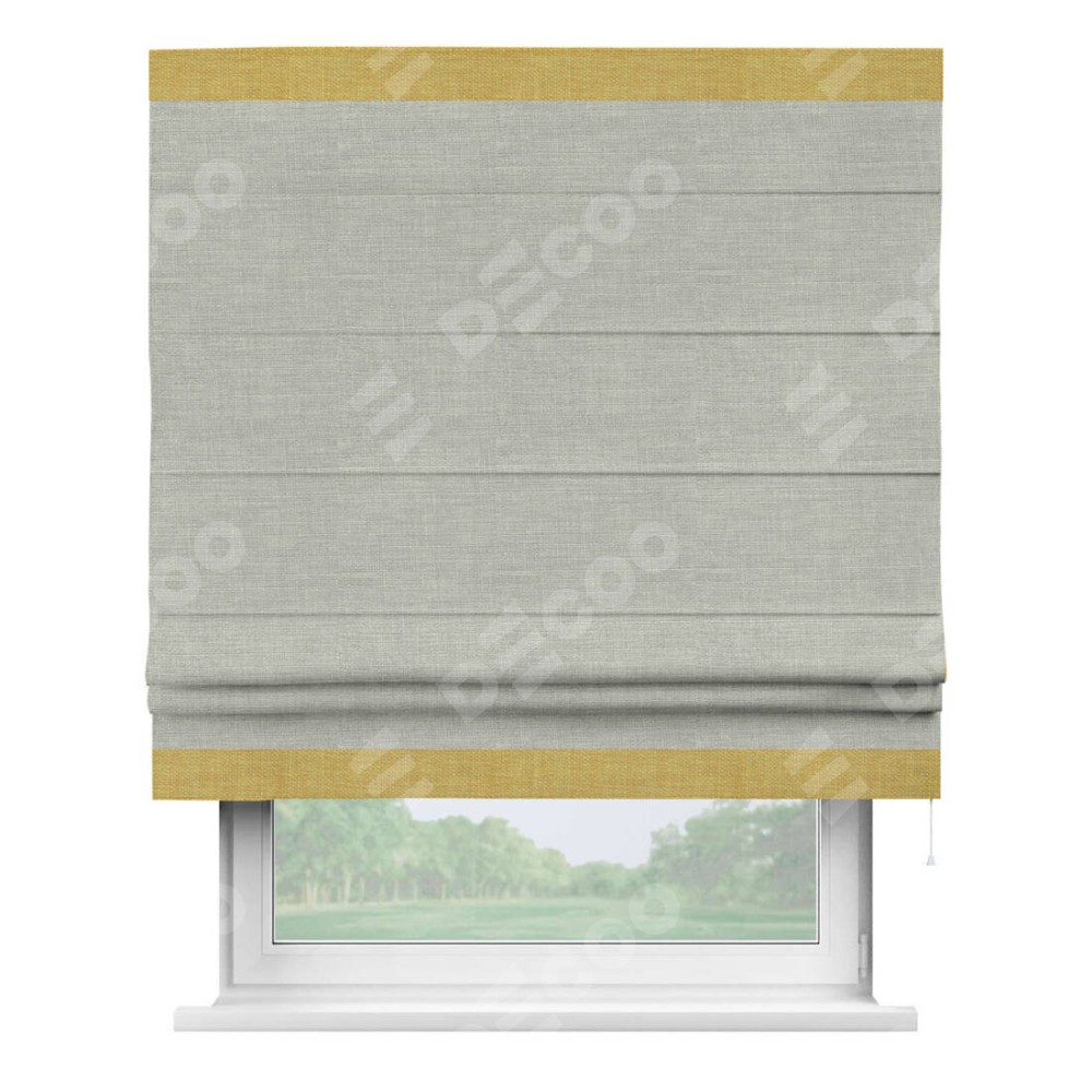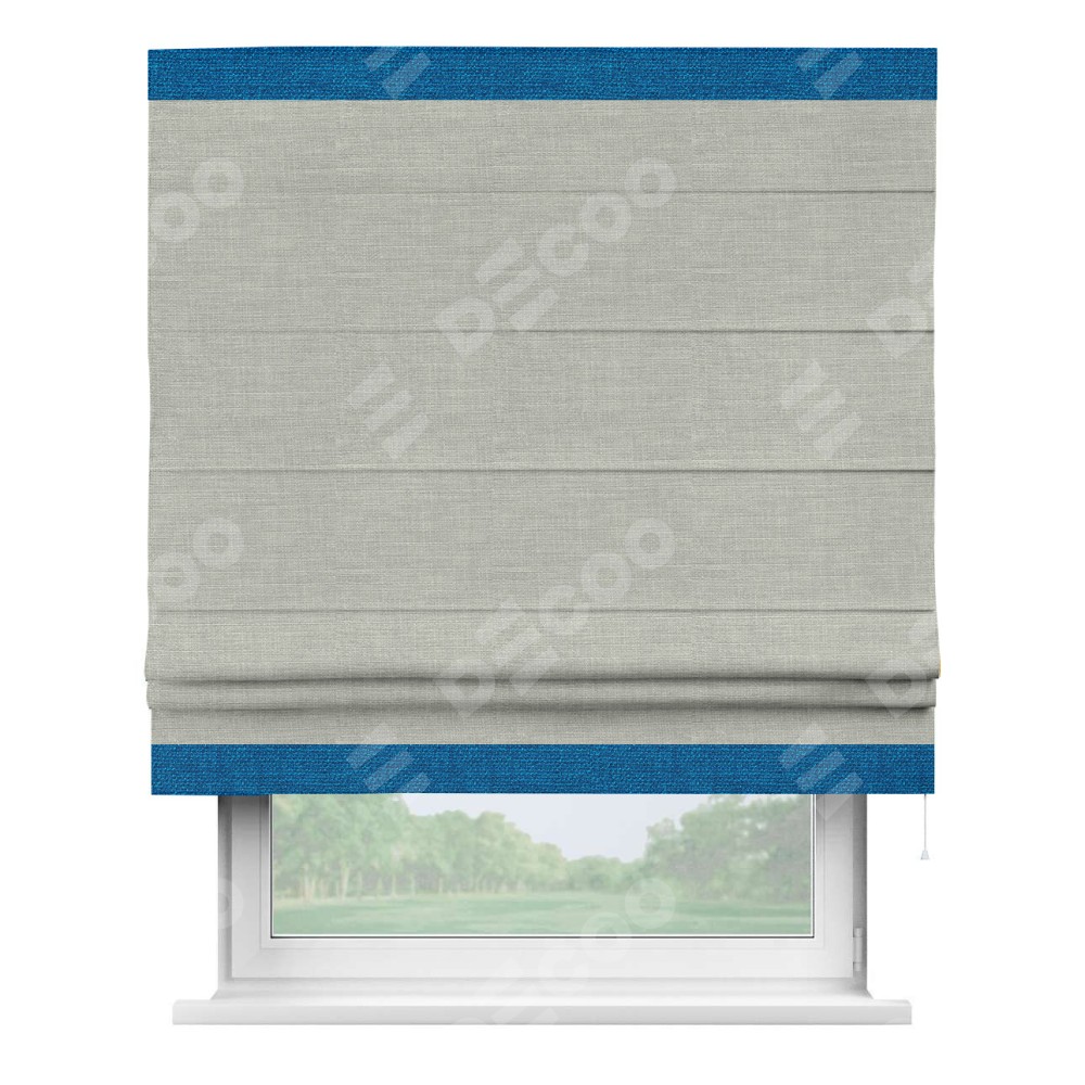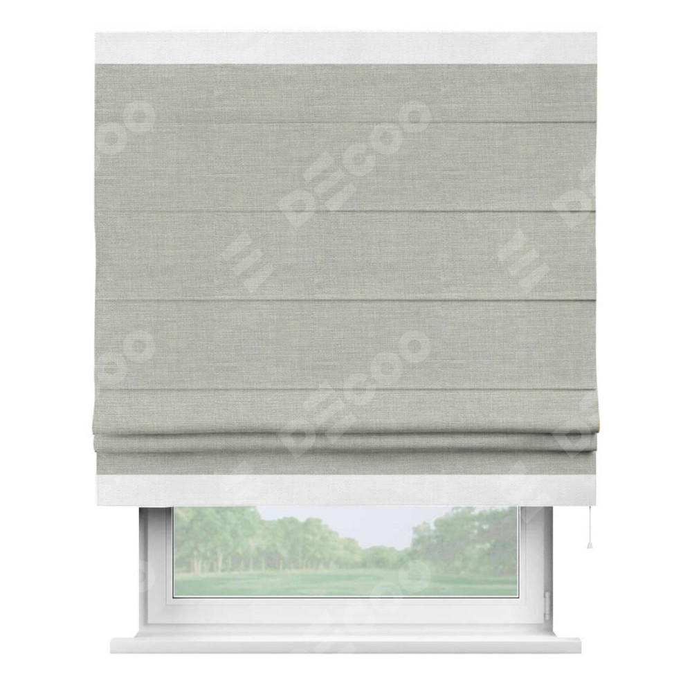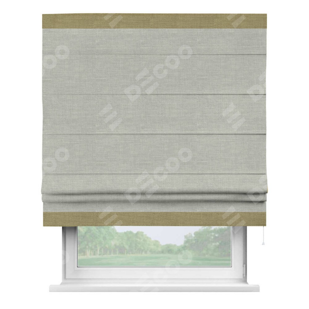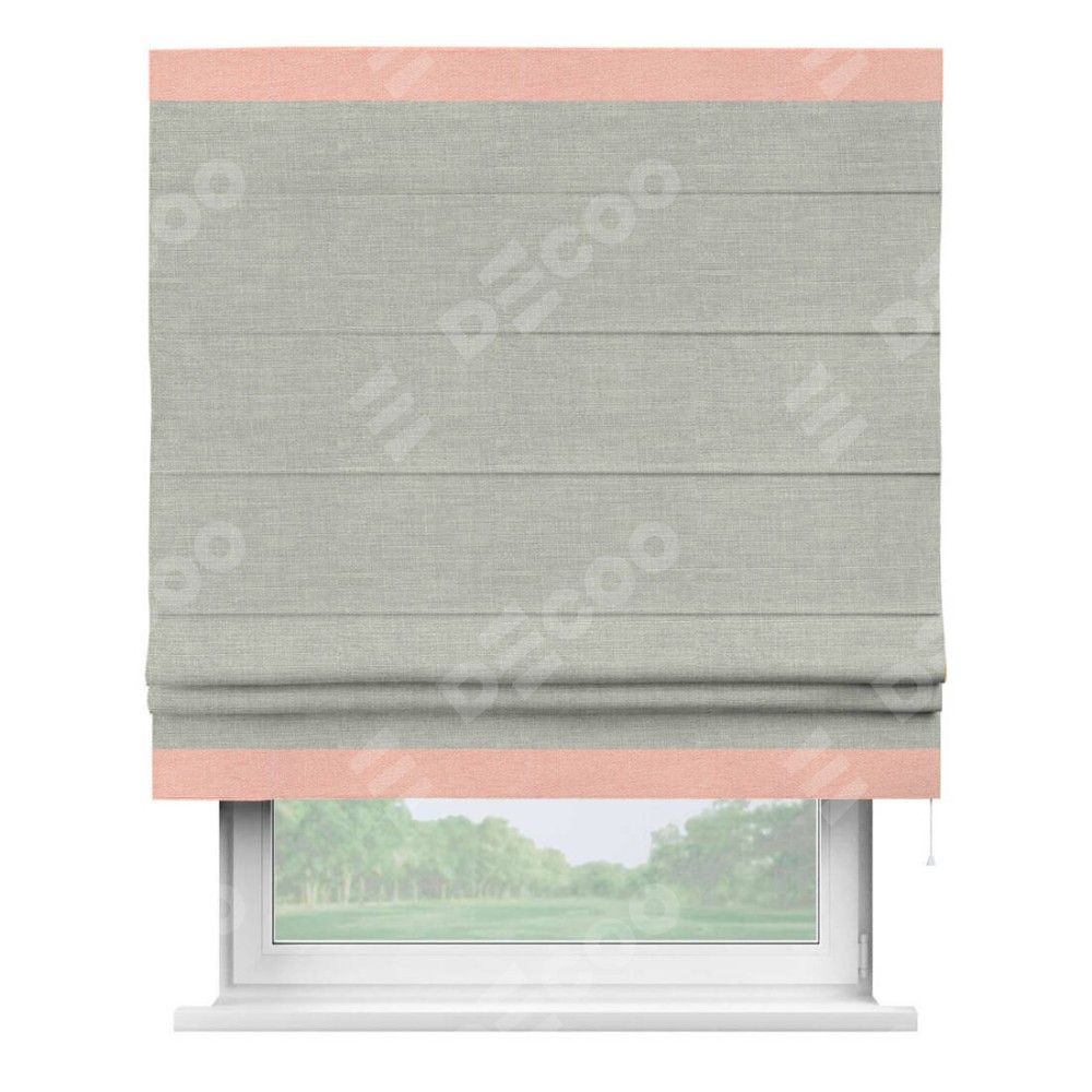Римская штора производителя «Cortin», используется для проёма, пошита из ткани лён серый, артикул 7440. Отделка шторы кантом «Горизонт», ткань для канта используется из льна разной расцветки на выбор. Имеет универсальный механизм и подходит для монтажа: на потолок, на стену и в нишу.